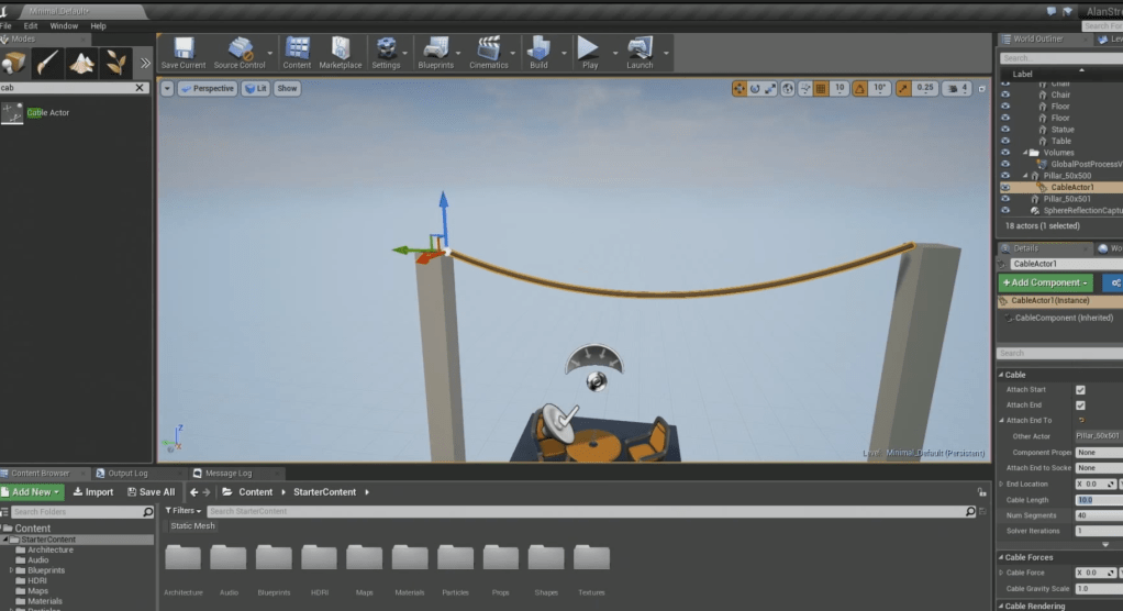 By some dumb luck I happened upon a video from Unreal about this object called the Cable actor. The video was originally uploaded in 2016, and I assume it’s been in the engine ever since. This is why I should have taken a class or done a proper overview of all the tools of Unreal Engine. Had I found this sooner perhaps I would have gotten more done for the whip development. Anyway at least I finally found something that seems to work well as a whip. It doesn’t act strictly as a weapon, it merely renders the whip and I have to figure out how to translate that into gameplay. Basically creating an invisible impact point of where the cable/whip ends up. So far I have it working to snap back and forth, and pushing objects using a simple collision that appears and disappears.
