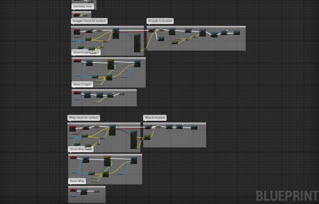 I put a video up here where I show the functionality I have so far. The visible lines are the line traces for debugging. So far I’m very happy with how the whip is working. It can translate to a lot of fun gameplay, and perhaps more platforming than I had originally anticipated.