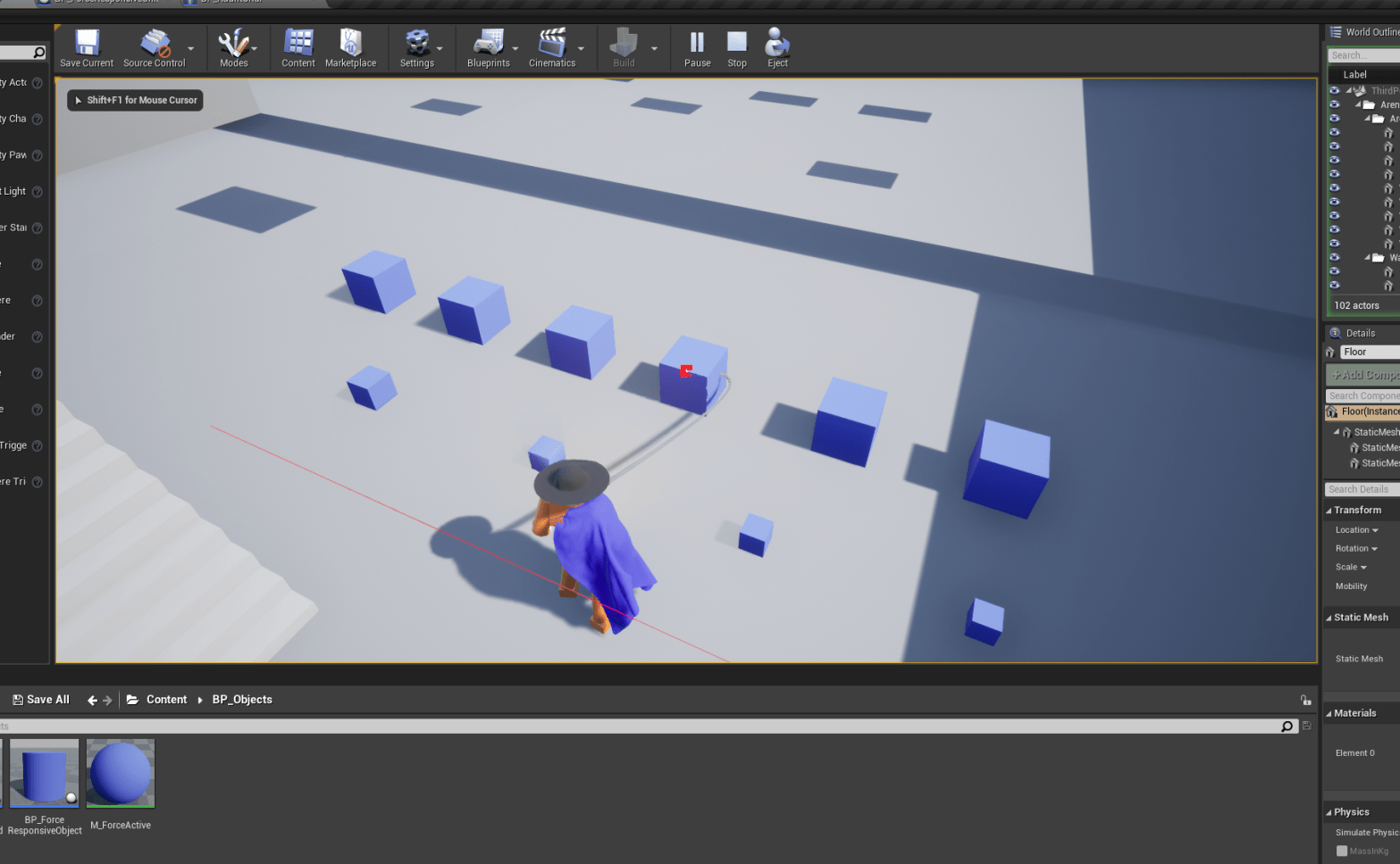 I was having problems with the whip getting caught in everything, so I cleared up some functions and started from scratch. I took what I learned from the line traces and worked backwards. I got a decent looking whip out. The blueprint is getting bigger and bigger, it’s becoming quite a monstrosity. Getting to more complex mechanics is always fun. I need to design objects that can be pushed and pulled, and other objects that can only be used for swinging. If I keep the grabbing and throwing mechanics I have to create small objects that are throwable. So far the throwing is very buggy. The animation doesn’t play when you try to pull, and the object in the hand seems to collide with the player. I need to figure out how to turn it off while it’s in the hand then turn it back on again after its launched.