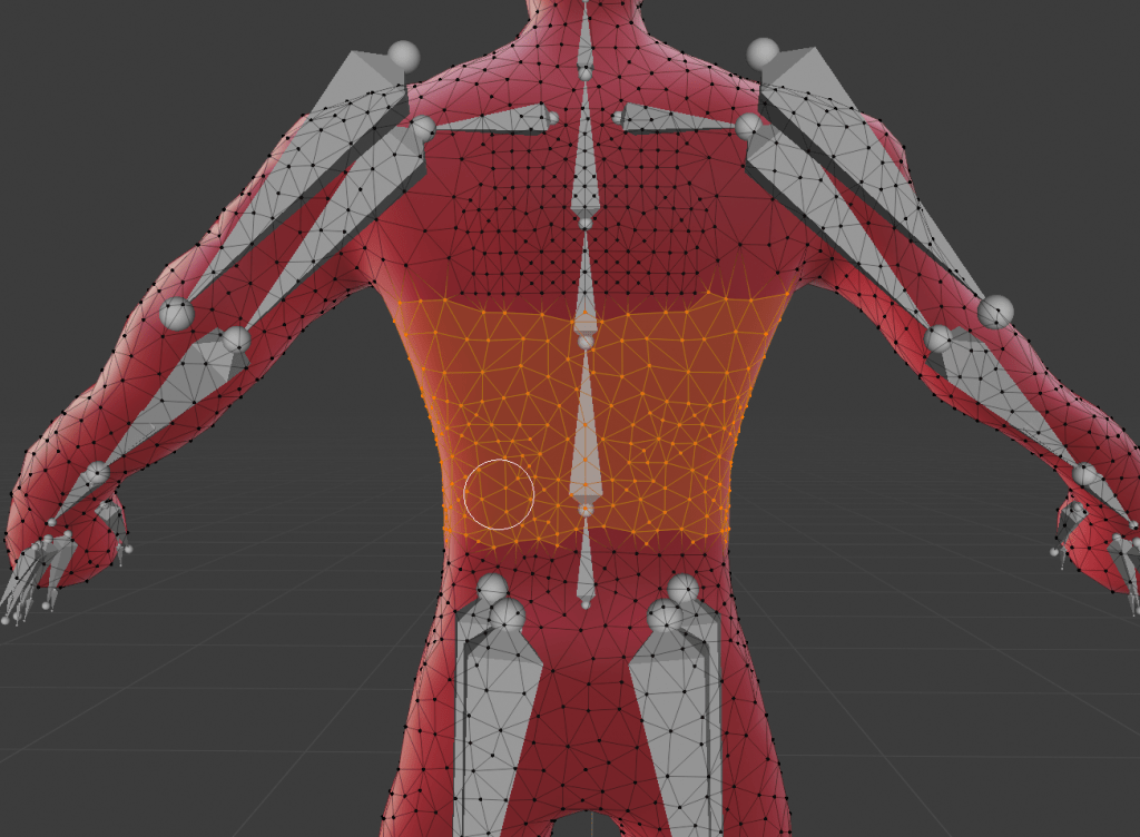 From a simple stick figure it slowly evolved into a strange humanoid beast. Much like the monster in The Thing, great movie by the way. After a lot of trial and error, and jumping back and forth between Blender tutorials and custom mesh tutorials I found a way to make sure the mesh matched the skeleton. There were a lot of problems at first, mostly cause the model wasn’t symmetrical. Good thing I learned how to mirror models, that made the biggest different. Eventually I used the color code trick for the specific parts.
