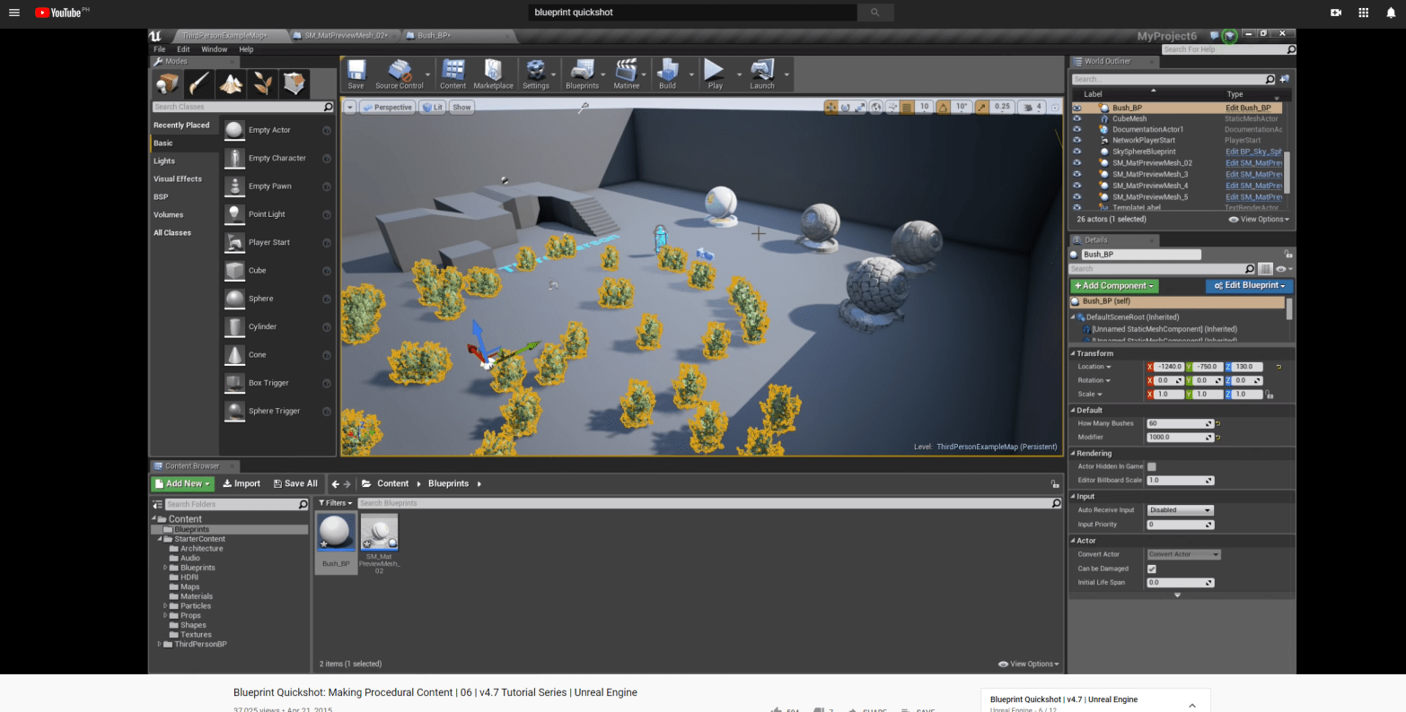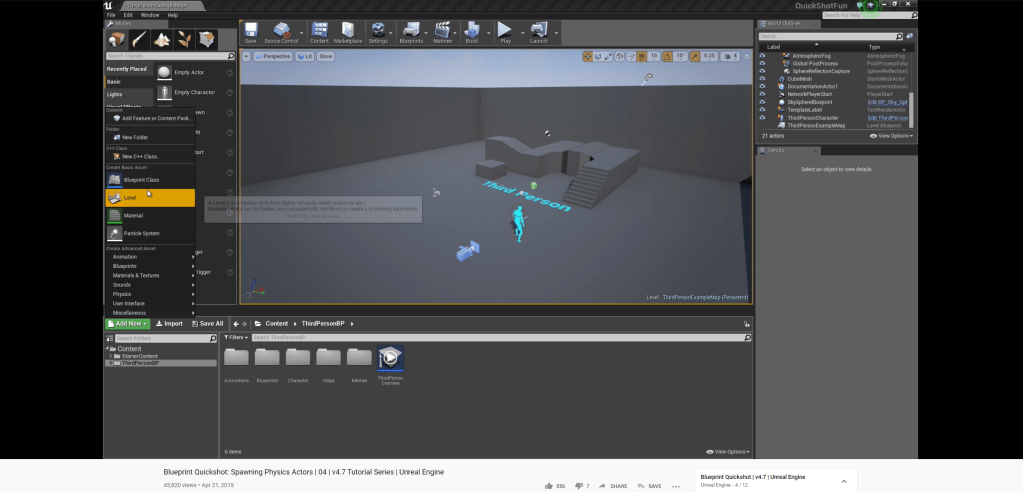 Unreal has a few quick tutorials that show off some random features from the engine. I spent the early parts of my day watching a few of these to get some inspiration while thinking about that my next step was. I knew that I wanted to fix to fix the whip, because previously the would not me coming from the hand, but instead from the character’s chest. Since the tutorial I watched was meant for a first person character, the issues I had were not addressed. Thankfully I thought more about how to play around with the cable actor and a tutorial from awhile back showed me how to spawn an object that I can attached the cable to.