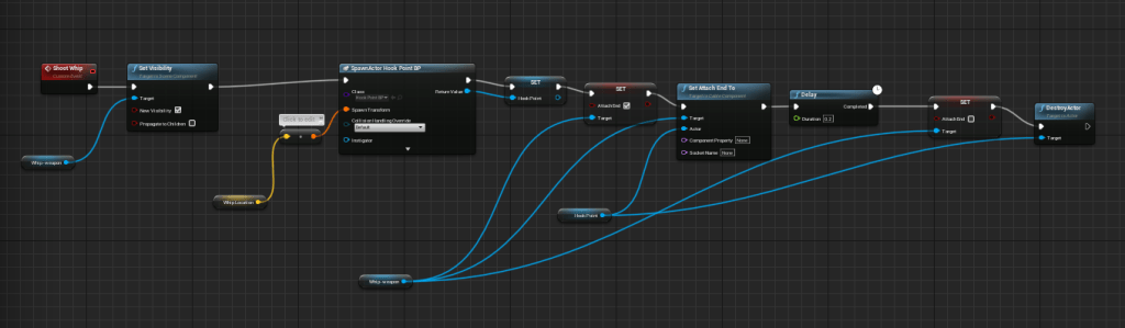 So all on my own I deleted all the old sequences for the whip and created a whole new one. This one spawns an invisible object at a point of impact, the cable/whip then attaches to this point then detaches to simulate a whip effect. The invisible actor is then destroyed so it doesn’t become a problem having all these invisible actors in the world. I finally fixed the biggest issue I had with the whip rendering. I should be finishing the whip abilities soon, the last one should be the swinging. With it being able to do damage that should be simple enough compared to everything prior. After that I’ll work on getting the lantern to affect objects in the world as well.