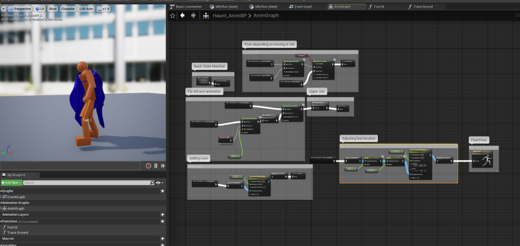 There are a lot more variables added now to the blueprint, this just means the character is coming together quiet nicely. The next thing I am working on is adjusting the height of the feet based on where the character is standing. It’s such a simple difference in terms of what you see, but it makes a big impact in terms of immersion into the world. So basically I was taught to cast a line towards and based on the difference between that line and the ground you then adjust the feet accordingly. It still is a bit wonky on stairs, and needs to be disabled while jumping. But damn does for such a simple feature it really does look cool.