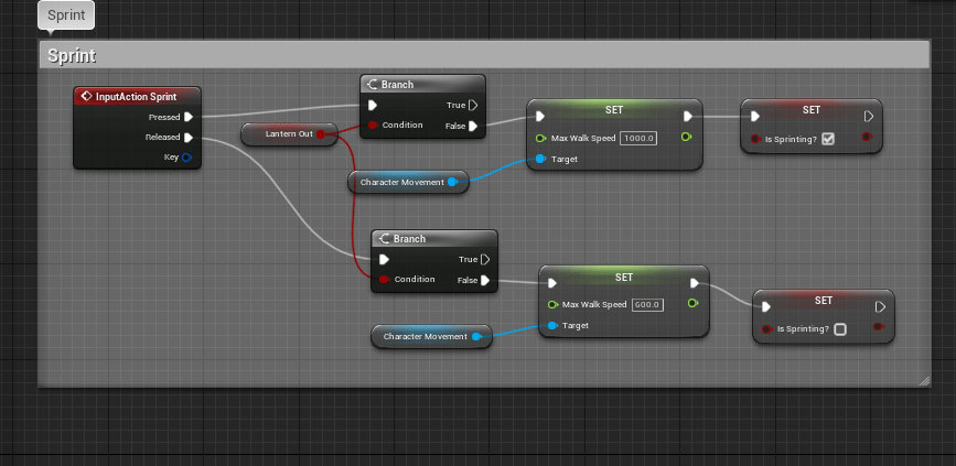 Before I moved on to more game mechanics I wanted to really refine the character animation. There’s so much I still haven’t done, and so much that I am still learning. I want the character to feel dynamic and alive, while the model is simple I want it to be fluid and react to the environment. Looking around the comment sections of YouTube and Unreal forums everyone says that 3D animation for characters is really really involved, that’s what discourages many people. Lucky for me I’m both stubborn and blindly ambitious. Today I began with adding a sprint to the character, and the added motion of him leaning based on the direction you are turning. I also furthered refined the actions, so you can’t do everything at the same such as sprinting while the lantern is out, or pulling the lantern out while you are attacking. It’s simple things like these I need to catch while I’m the early stages so I don’t have to worry about too much fine tuning once I get to the big picture stuff. A helpful video from Unreal showed me how to make the attacking look better, it was too stiff before when the character was stationary, now he does the whole animation unless you are moving.