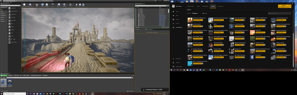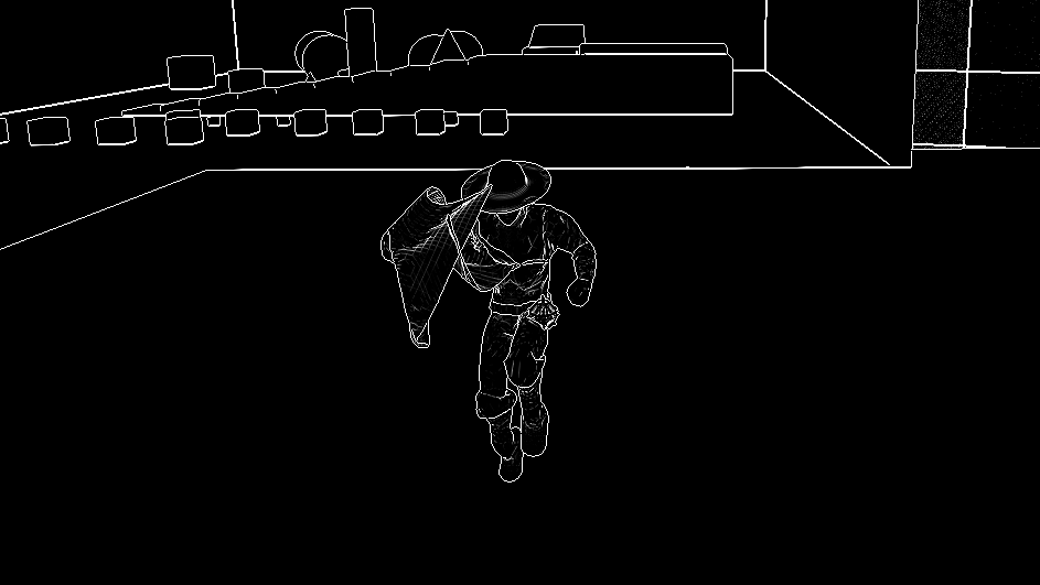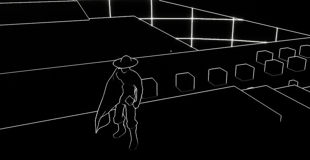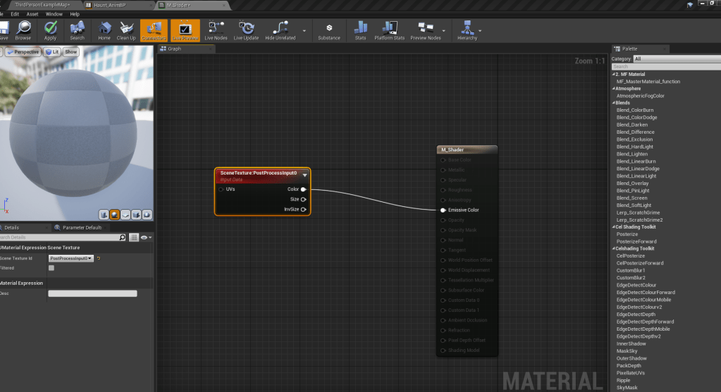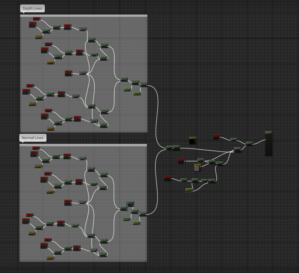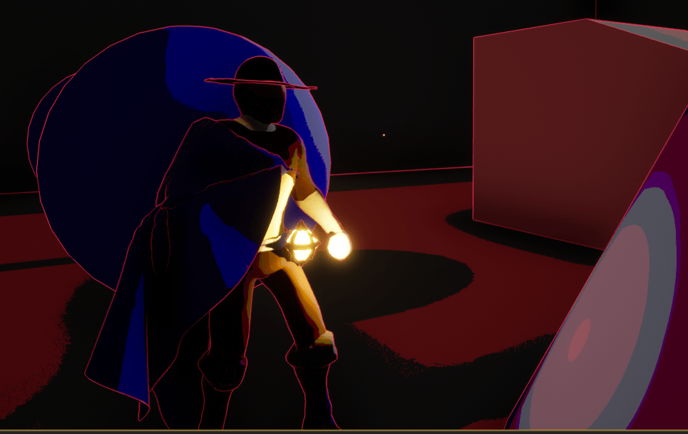 I’m just gonna dump all the screenshots here. I also put the character in some environment examples to see what it would look like in different situations. It looks very pleasing. I need to continue adjusting the settings so that I can fine tune it to the way I want it to be. The blueprint for the shaders is quite large but it’s not very complicated. It basically looks at every pixel and adjusts the color around it accordingly. The video from Unreal gave me a way to outline objects, whether I will keep that look is yet to be seen.