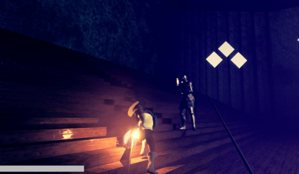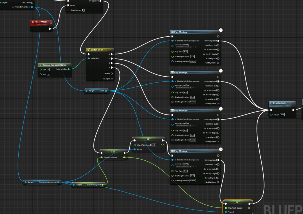 The next improvement was on the boss’ brain or at least arsenal of attacks. I got some more animations from mixamo and was able to give the boss more options for combos. The wiring gets more messy as it always does, even with lots of organization some things are bound to overlap. I’ve got it doing more attacks with a wider variety. After fighting the boss in the dark it seems quite clear it is a difficult fight. I think with a few more additions on the actions of the AI it might turn out well for the very first boss. Quick and simple is my goal for this first level. It killed me fast as you can see with my life bar below.