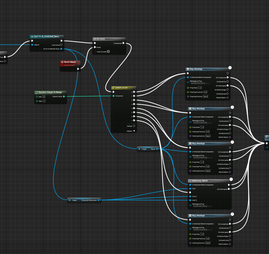 After fighting the boss a few more times I got jealous that he had different attacks so I decided to give the player more attacks as well. Through all this I’m learning more about how to add events/functions from the animations themselves using notifies and notify states. Basically at a specific frame of the animation I am calling an action to take place, and then insert the complicated stuff after. This will all be handy since so many of my animations were being handled with delay nodes, not great practice because some functions would fire off despite an animation not finishing. As of now the fighting feels better, but not as dynamic and fun as I want it to be. I’ll keep chipping away at ideas before I have to add stamina as a resource.