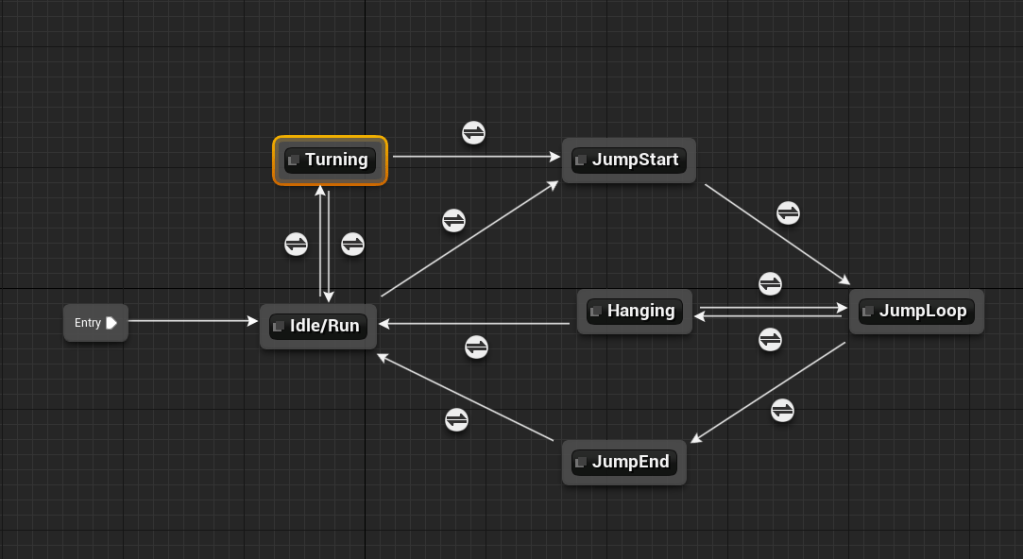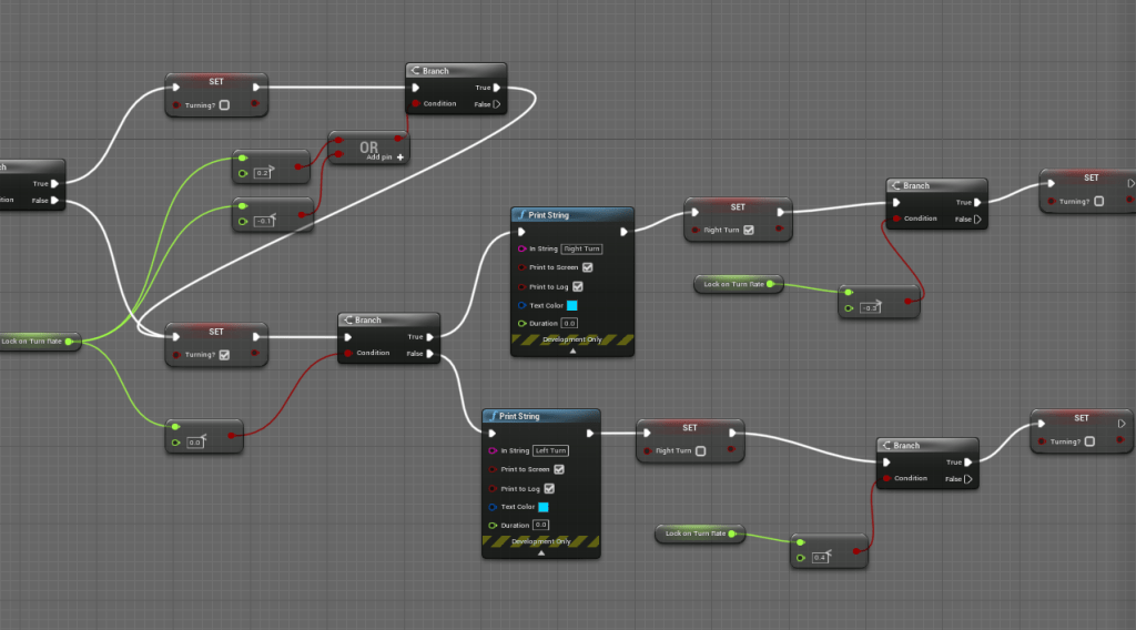 My next problem was trying to create a smooth turning animation. There was a problem with the character flipping around too quickly to the camera. After a lot of fidgeting and trying different numbers I accidentally fixed the issue by removing using the Controller Rotation Yaw. Basically I was driving the rotation of the character based on the camera, but I was already setting the rotation somewhere else with the lock-on mechanic. By turning off the use of the Controller Rotation Yaw the character wasn’t turning too abruptly anymore.