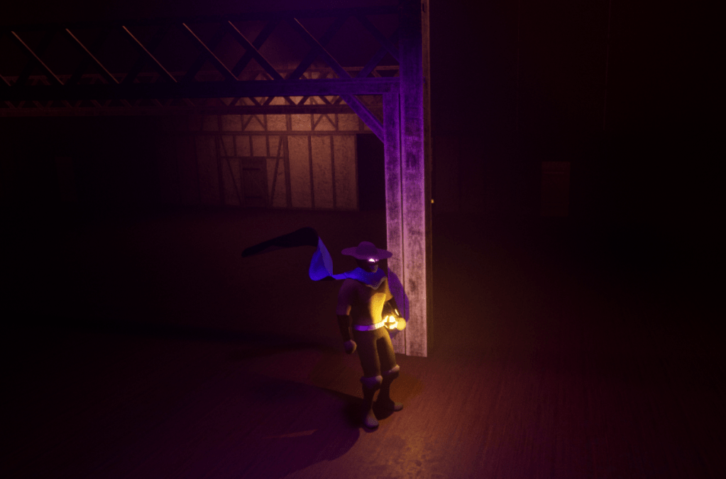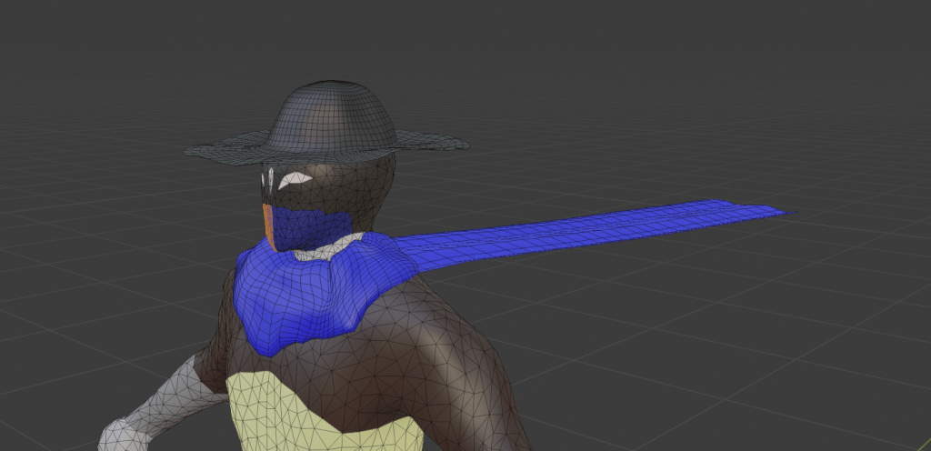 I have continued working on the player model. This is model version 13 at this point I believe. It is more of a scarf than a half-cape in this version, and it will probably stay that way. A scarf has a nice flow and doesn’t look as buggy when the model goes through it compared to the previous versions. I did like the looks of the cape, it had an air of mystery, but it wasn’t as practical as this one. I’ve also added more detail to the head so it appears that the mask covers the face and includes a scarf. I may add more later on but this simple model works very well for me.