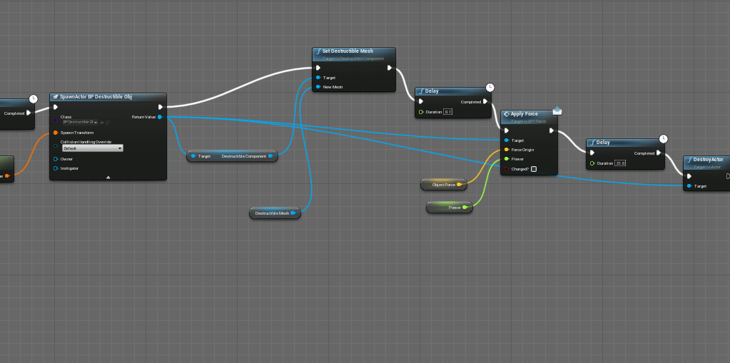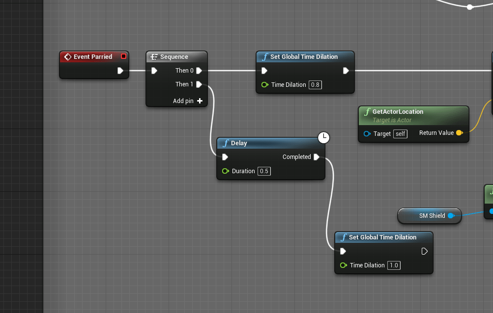 As I had also wanted to work on the breakable objects I found a way so it shattered more consistently. It’s a bit of a shortcut, and I don’t see the need to change anything so far. The object hits, and is replaced by a destructible object which explodes into many pieces. A another small addition I made was to add a slow motion effect on the parry as well. To drive home the signal that a parry was successfully completed.