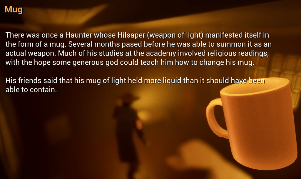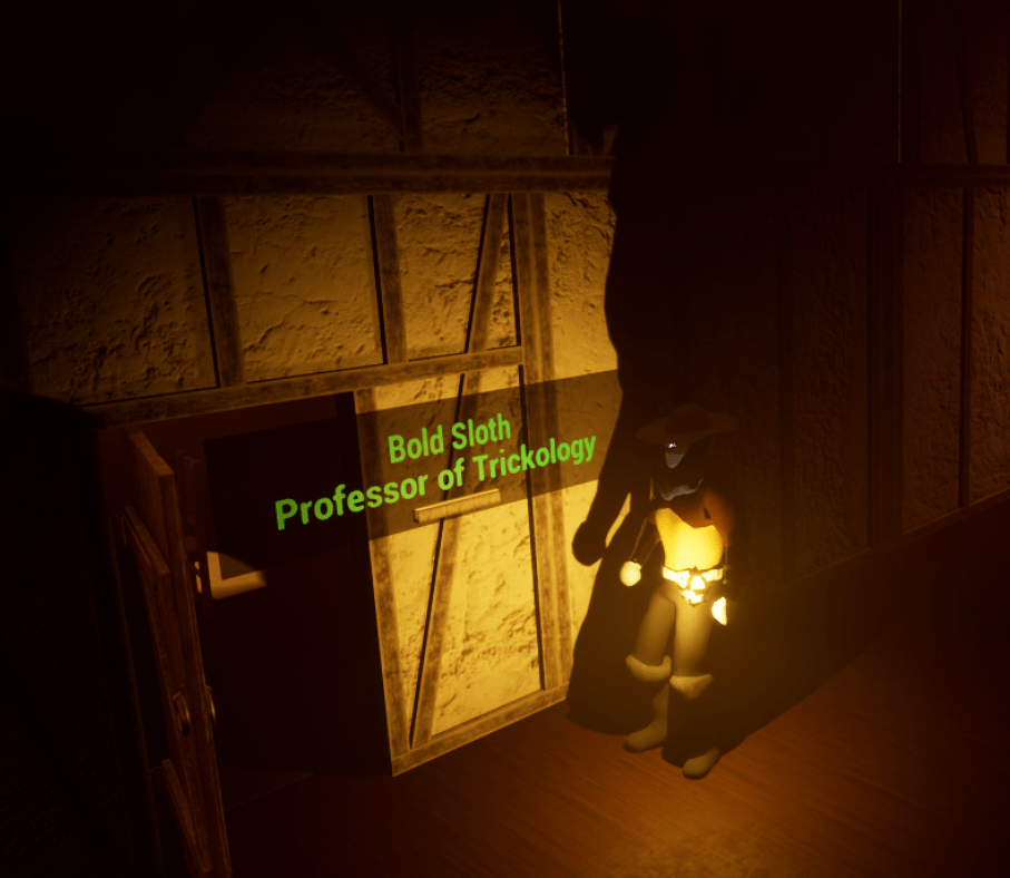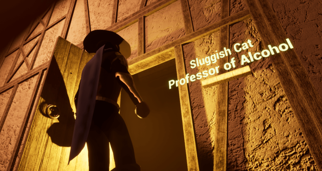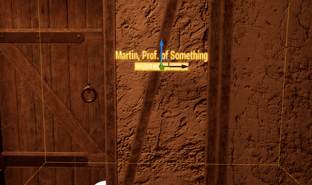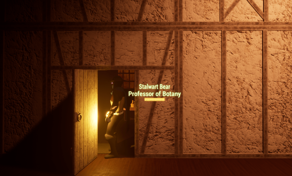 As far as the level development is going I didn’t make any gigantic updates today. I did make important ones though. I have known that each room is assigned to a professor, and the item to be discovered inside has something to do with their specialty. So I added a small name plate just outside the door of each room. It’s very rudimentary, and it doesn’t have to be anything more than that. Coming up with the names was fun, and creating item descriptions was also fun but more taxing. I wanted each item to describe something unique, but I didn’t want each one to follow a certain format or flow. That way it is obvious I carved out the details.