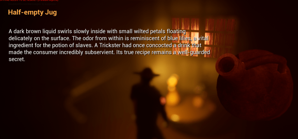 There were also some bugs I found and squashed quickly, and another I haven’t been able to replicate. It will come up again I’m sure. I continued to work on the item descriptions, since the rooms were basically finished I completed all the name plates and object details. I thought about the font and I knew it shouldn’t be anything fancy. The text was clear but I wanted it to be super easy to read. So I added a translucent background to it. Readability and accessibility is a priority for me as well so I checked some guidelines for dyslexic friendly font. Arial looked like a good choice. Imported it into Unreal and changed the fonts of the text in-game. I do like Arial better than the default font that Unreal uses.