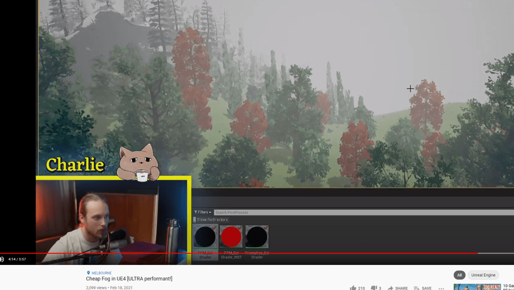 Went back to my game and thought about the fog and how it really helped with the atmosphere but the normal fog in the game ate up a lot of the performance. I recalled I had seen a video on “cheap and perfomant” fog. So I checked it out and followed the very quick tutorial to put it together. It was incredibly easy and cheap. Basically it is a post-process material that creates a fade within a certain distance, a fog that isn’t costly and still looks great. I played around with the values of distance and color until I found the right one and it fits great. The fog also helped with the problem of some areas being too dark, now it draws certain objects more clearly thanks to the coloring.