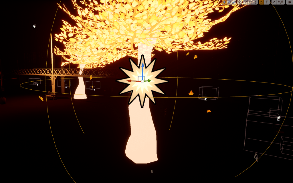 Threw on some glowing falling leaves on the trees because I think it looks very cool. It really helps with the aesthetic of the area and it doesn’t seem to have any crazy cost on the performance. I’ve had these free particles for awhile and I just had to go through all the types of leaves and find the right one. I edited the material slightly to my needs to make the leaves glow especially then placed it carefully on each tree and voila visually pleasing.