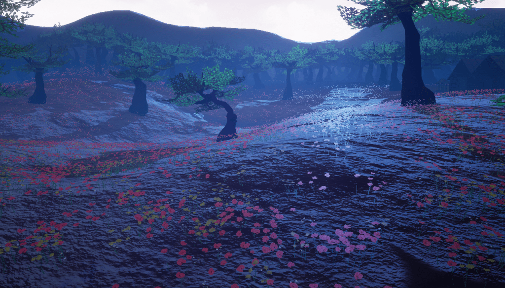 What took most of the day was figuring out the best amount of foliage and its light settings, such as dynamic or static shadows. The place was very pretty with tons of grass and flowers but I had added so much originally that it was quite expensive in terms of performance. I kept taking out more foliage, changing the settings to make it not cast shadows. It was still too much. When eventually I just decided to remove all the grass and keep the flowers. Since the grass took up most of the area it was the easiest choice to remove. It was either all or nothing. If I couldn’t keep a ridiculous amount of grass it’s better that I didn’t keep it. The place still looks pretty with the flowers moving with the wind at least.