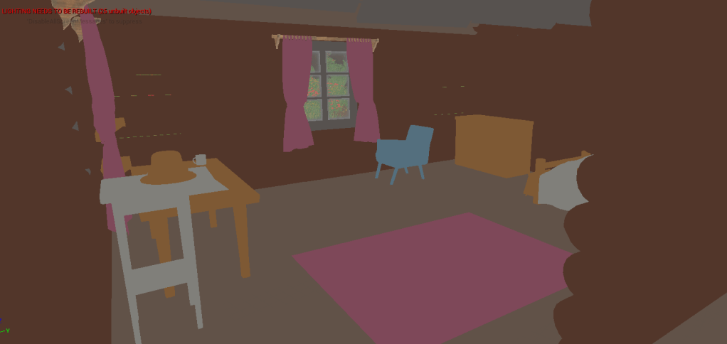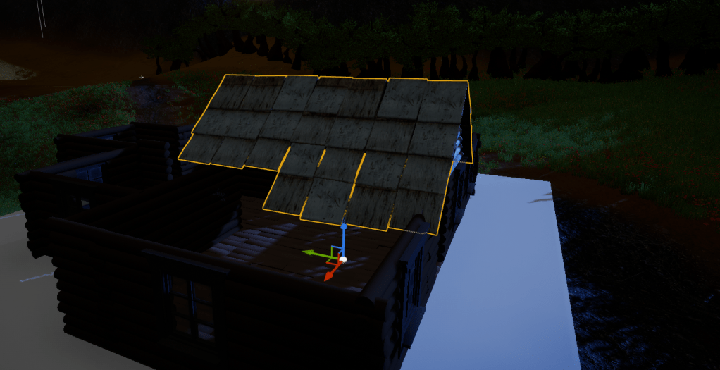 The roof for the cabin doesn’t have a symmetrical model so I did have trouble making it fit above the walls. I did my best by just adding several roofs but because of the way it was built it dips into the house. I will see if there is a way I can slice meshes in the engine or I will resize it to make it high so the insides don’t feel so cramped. All in all the cabin isn’t as large as the first level but it is more varied than just a simple box shape. Also finally created a blueprint for the interactable items so that I can easily add different types without having to make them from scratch. I didn’t have a proper template before. Took a few nice scenery pictures before I started set dressing the house with props.