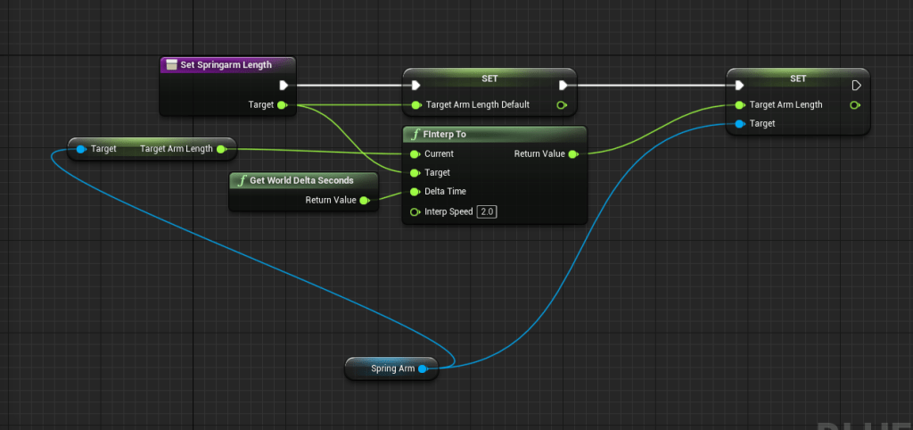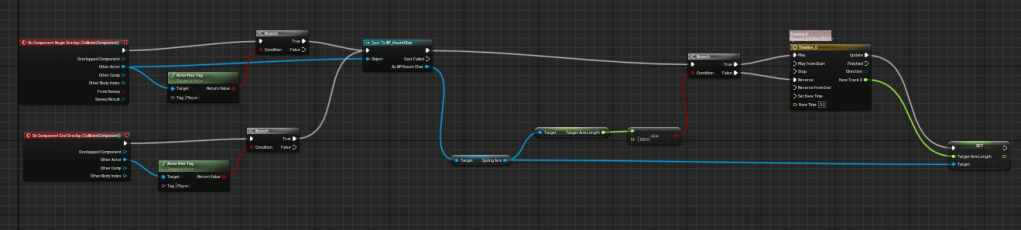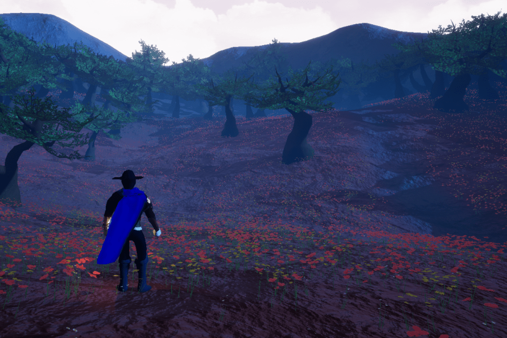There didn’t seem to be a good way to improve the cramped space of the cabin, at least so far, instead I worked on a way to push the camera closer to the player so it wouldn’t be as annoying navigating the space. There are a few issues with it since there are other functions that can also control the camera. But it’s not a big deal since the cabin is only a small portion of the level. I made it a collision box that encapsulates the entire cabin, since you can spawn in the cabin the camera should be affected right away, and when you leave it should go back to normal. I will try to figure out a better solution in time. Also made the dirt a bit more red to match the flowers and complement the blue fog.