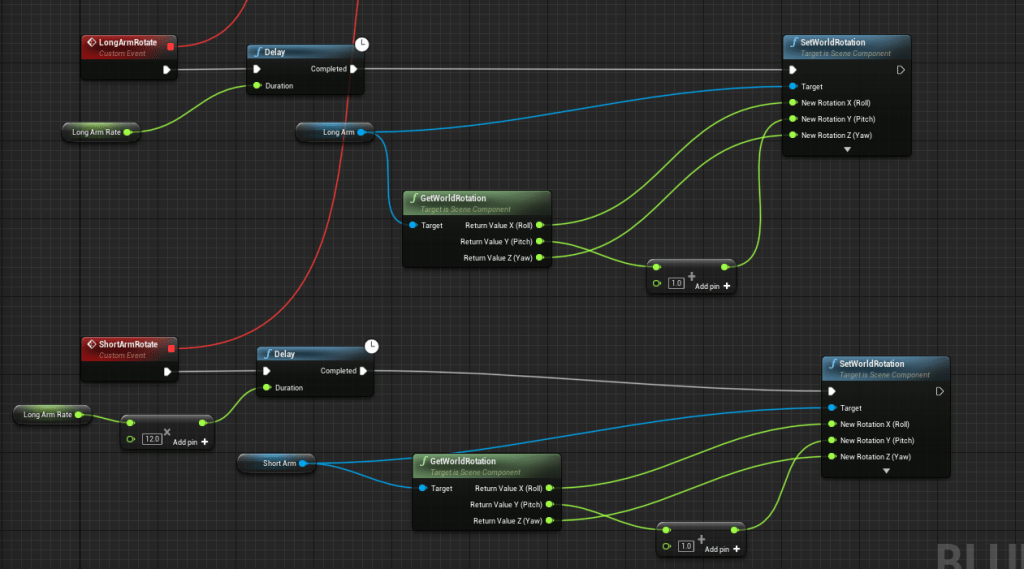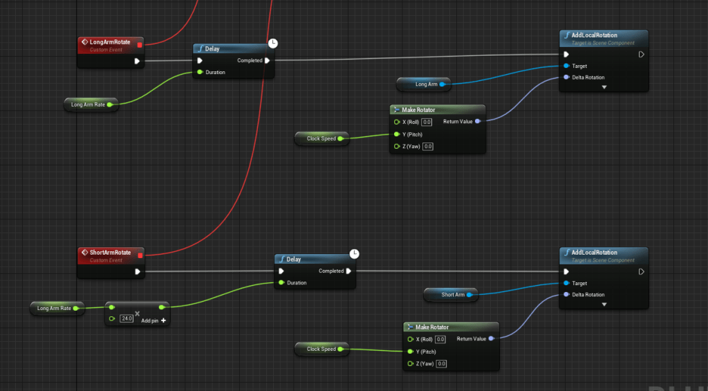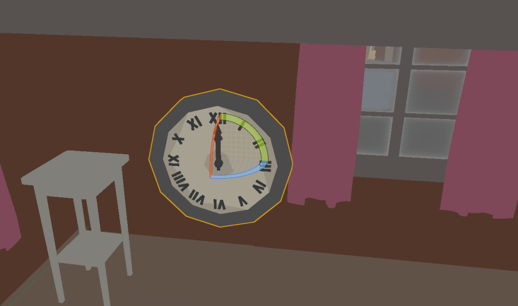 I spent a decent amount of time working on the clock with it’s moving arms. I’m not sure what benefits I will get from having the arms move quite realistically. Meaning that the speed at which they move is almost the same as they would in the real world. So when the short hand is at 2 then the long hand is at 12. It’s not right on the dot but it is close enough for my liking. The great thing about this is that there are so many ways it could be done. I went with simply having a different rate at which the rotation of the long arm and short arm rotate. There is a bug in the engine with adding to the relative or world rotation, but adding to the local rotation did the trick.