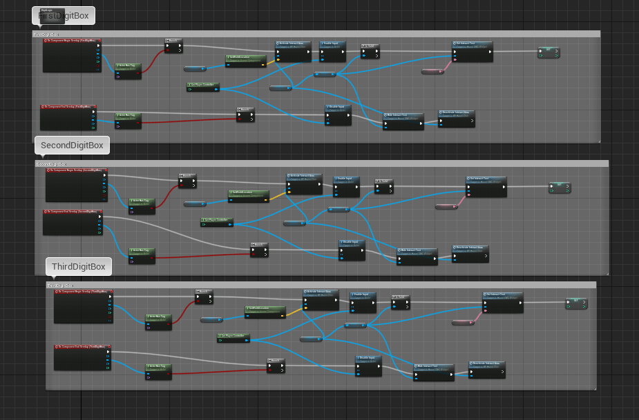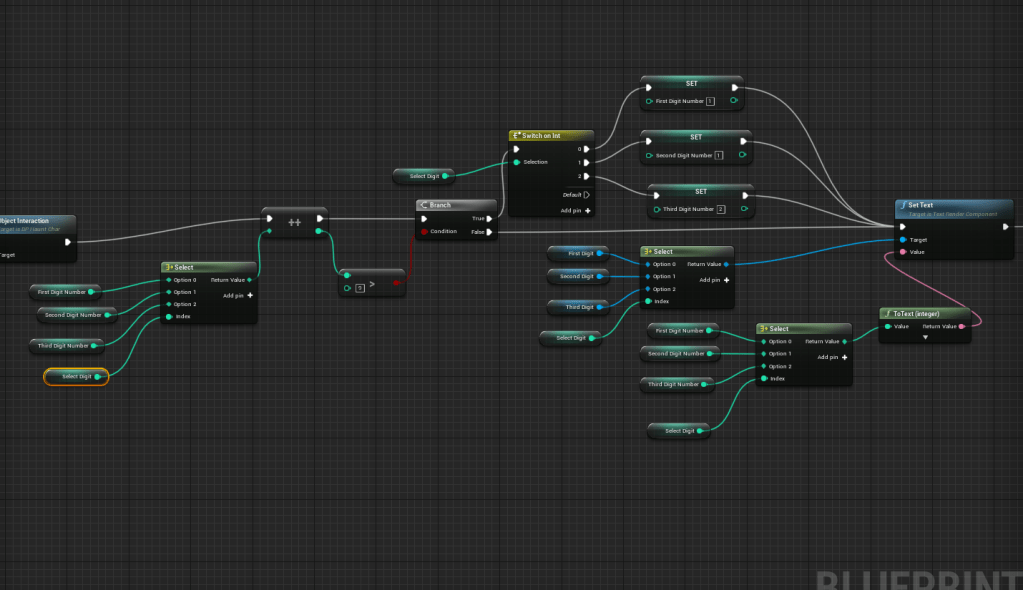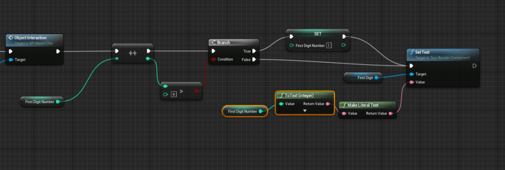 I took some time to think about how I wanted the puzzle in the cabin to work. There was a general idea of solving the cypher, and I knew I needed the numbers to be put somewhere. It was all a matter of how would the player interact with the world to change wherever the numbers would be. I came to the idea of putting it on a table. With large numbers the player and change each one independently. I had to figure out how to do this best, did I do it separately or put all of them in one blueprint. Of course it was more efficient to put it in one object but it took me some experimenting to figure out the best solution I could think of. Using separate collision boxes on the object may be a tad redundant but it was the easiest and quickest way in my eyes. It was a simple and elegant solution to changing the numbers and setting the max to 9 so it resets to 1 when the number is changed.