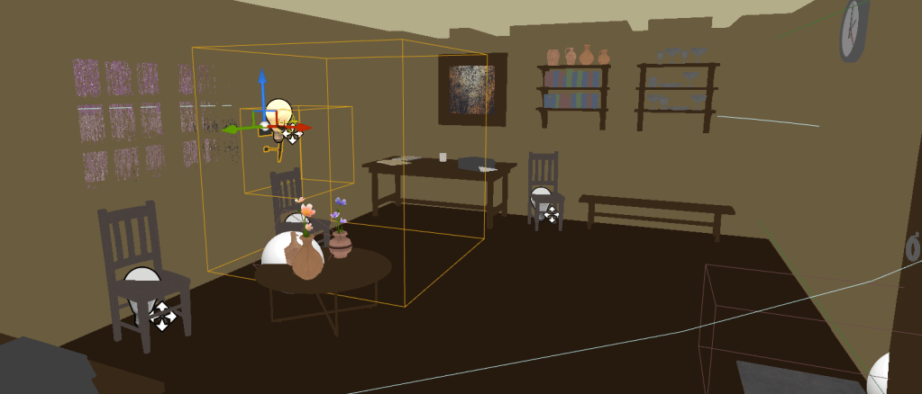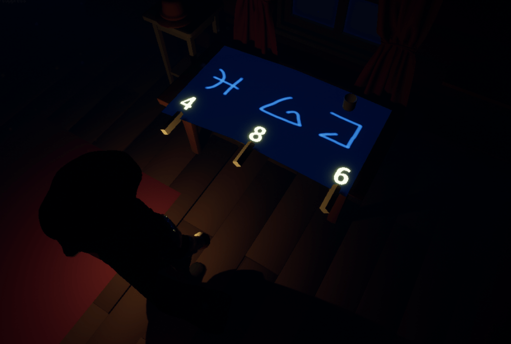 One of my favorite updates is adding particles that move towards the objects the player can interact with. It was clear that sometimes it was hard to tell what the text on the screen was referring to when the player could interact with an object. So by having a particle system move towards an object it communicates which object on the screen the player will be affecting when they press the interact button. From there I moved to the second level in development, the clock cottage. I added the final piece of the puzzle to help break the cypher. I’m not going to give it away of course. Just new clues in the final room. Then I made sure the house was extra dusty.