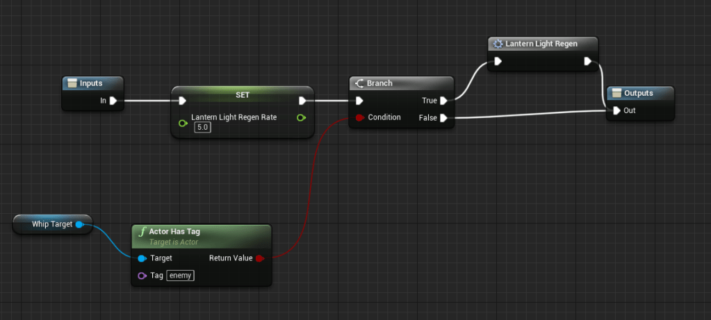 In one of my tutorial messages I say that hitting an enemy will recharge the lantern light, but the whip didn’t give any recharge. So instead of updating my message I changed some of the logic to make sure the whip gives some lantern light but not a lot of it because it would be too easy to exploit. I updated the collision for the lantern as well because the objects for inspecting could be grabbed through walls which I had thought to be fixed. With that I made sure the collision boxes for the items weren’t too close to walls to avoid clipping.