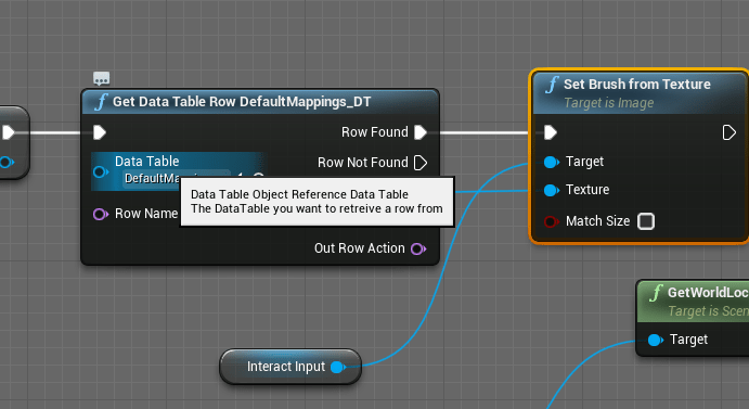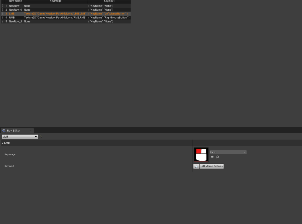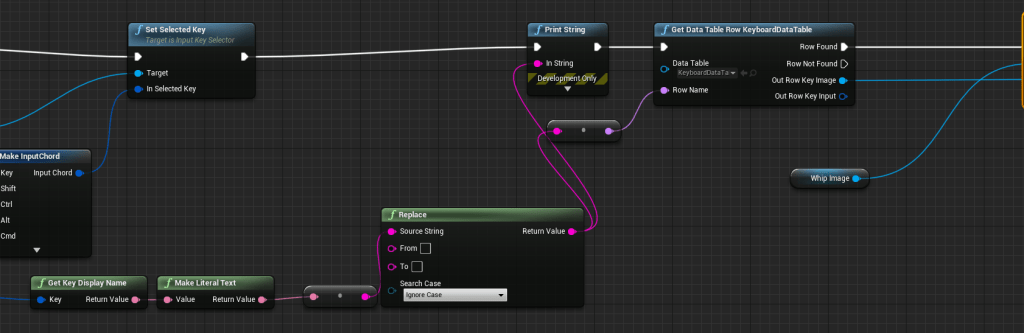 Dove right back into the videos to watch them again and again until I got a proper grasp of the topic. Getting a key was different from the key mapping, the key mapping is a struct in itself so it comes with other variables you can break apart. Got that down, and was able to make a small bar where you could finally change the key. But I was having trouble assigning the proper image to the key. In the DataTable it would grab the name of the row. The names of the rows couldn’t have any spaces, it was strict like that. When getting the name of the key it came with spaces and it came out as a Name but for some reason the Table node wouldn’t accept it. So I had to turn it into a literal text then it would convert it back to a name that the Table could accept. The name that came out of the Key had spaces. So, I found out a new thing node in Unreal, in strings you can replace specific characters. I replaced all the spaces with empty character so instead of Right Mouse Button it would convert to RightMouseButton. Boom it accepted the name and grabbed the proper table row. Such a simple solution that worked so well and the images were popping up and the keys were changing properly.