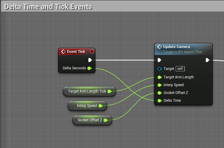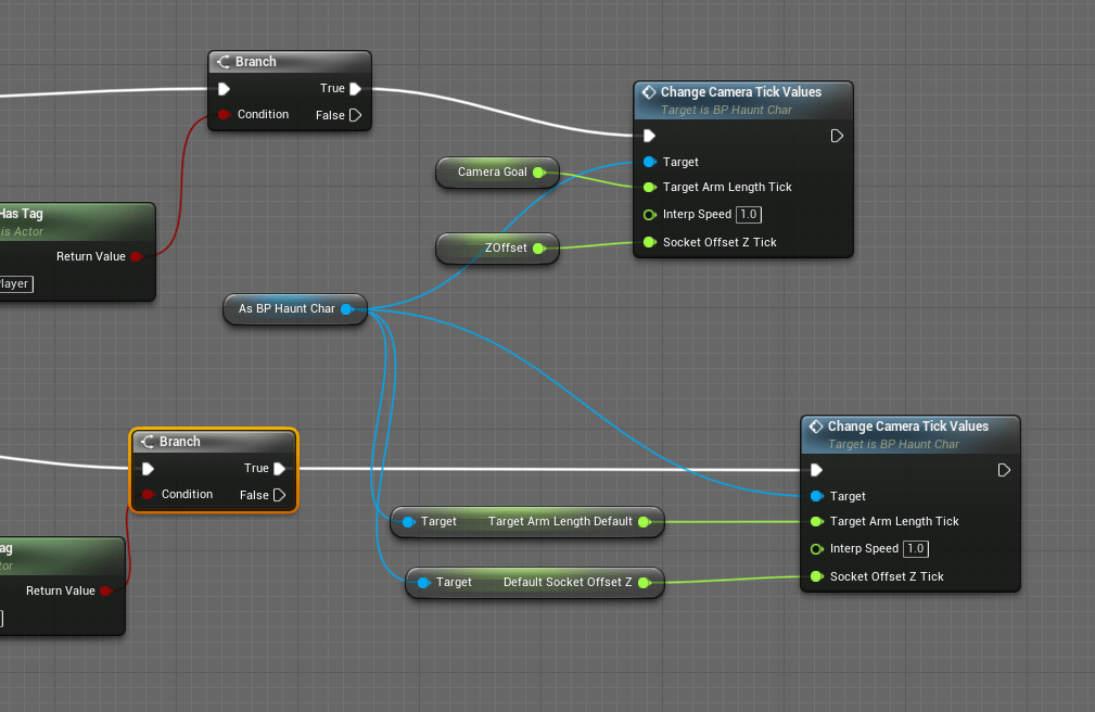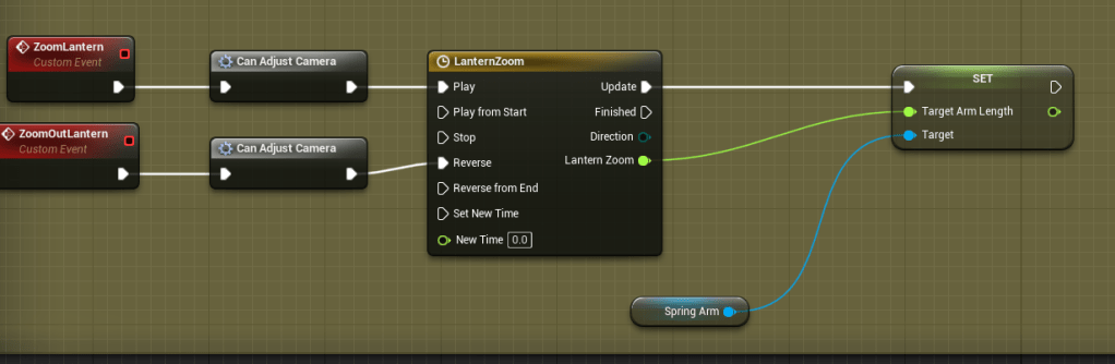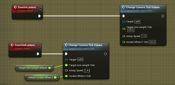 I also figured that since the lantern is about investigating and looking carefully it should be good to add a zoom effect to it. This took awhile because I had to figure out the best way to adjust the camera. Timelines were what I used before but it would be troublesome because I couldn’t change the values on the fly if I wanted to, and if I wanted other functions to affect the camera the timelines didn’t work in a function. So after some testing I put it on the tick event. I am very wary of putting anything on tick, so I can stay away from any unnecessary costs on calculations. But since it was a camera event it seemed the best place for it. I made two separate functions, one that updates on the tick and another to set the values for the camera to adjust to.