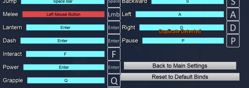 My greatest achievement of the day was creating the function for detecting duplicate keys. As all my code begins, it was overly complicated and inefficient. I put too much function in the menu itself, and not enough inside the button where the function should be laid out so it could be used anywhere. I tried a few places to do the key check, but the best time seemed to be whenever a new key was inputted into any selector. While it was fine that the menu had a big SIGN that said Duplicates Detected, I wanted it to be even clearer than that. On the button itself I slapped on the Duplicate text so that way when I got it worked each duplicate key would show that there was a duplicate somewhere. The goal was that you didn’t have to try hard to find the duplicate, it would be clear which key had a matching key. Maybe I’ll add text that showed which actions had the duplicate key, I’ll think about it.