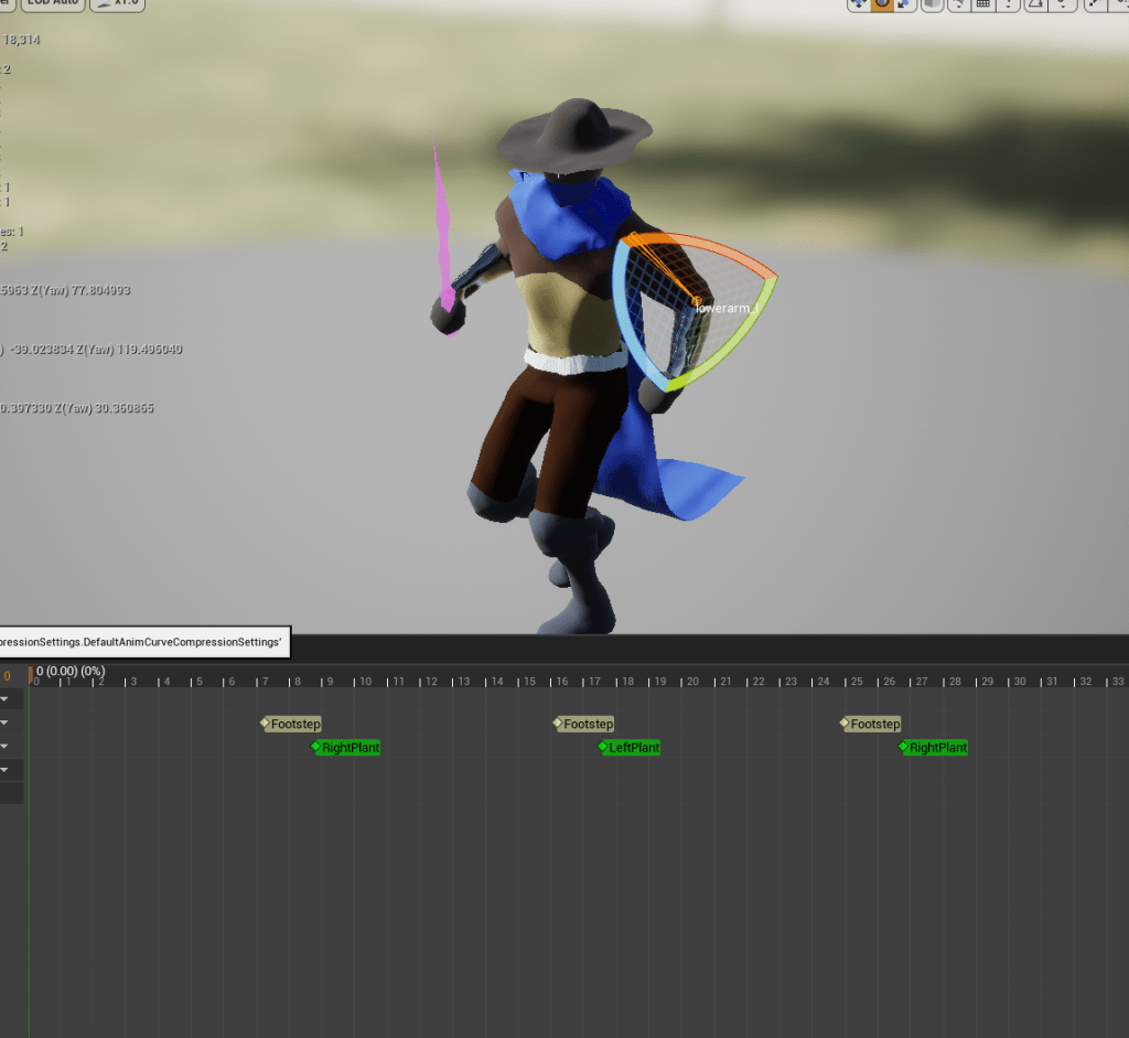 Having fixed the movement transitions I went over to adjust and change some of the attacks. With the heavy attack of the sword it was too inaccurate at times. The blade was too far off to the right when the animation slashed down, it looks like it should hit but it doesn’t. I easily rotated the hand in the animation to make the sword attack closer to the center of the character. It should hit more consistently now.