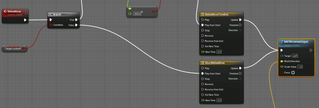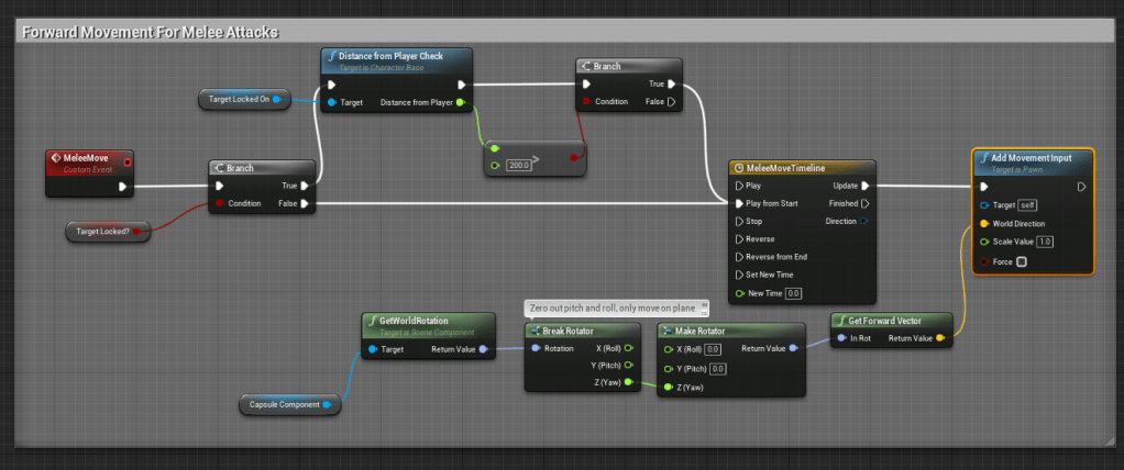 Over the weekend I couldn’t stop thinking about my problem with the camera jumping back and forth when it got too close to a lock-on target. I was able to fix this by identifying that it was the Y(Pitch) value of the rotation that was causing the issue, so I added a clamp to the value. So it no longer becomes jittery and the camera won’t become too vertically skewed. This change was also important to the big updates I made today to the melee attacks. I originally had root motion added to the melee attacks so that the character would move forward on its own when it attacked. The problem with this was that the player would often start to veer too far from the enemy because of the natural forward movement. I needed to figure out a way to have the character only move forward when the enemy was too far from an attack.