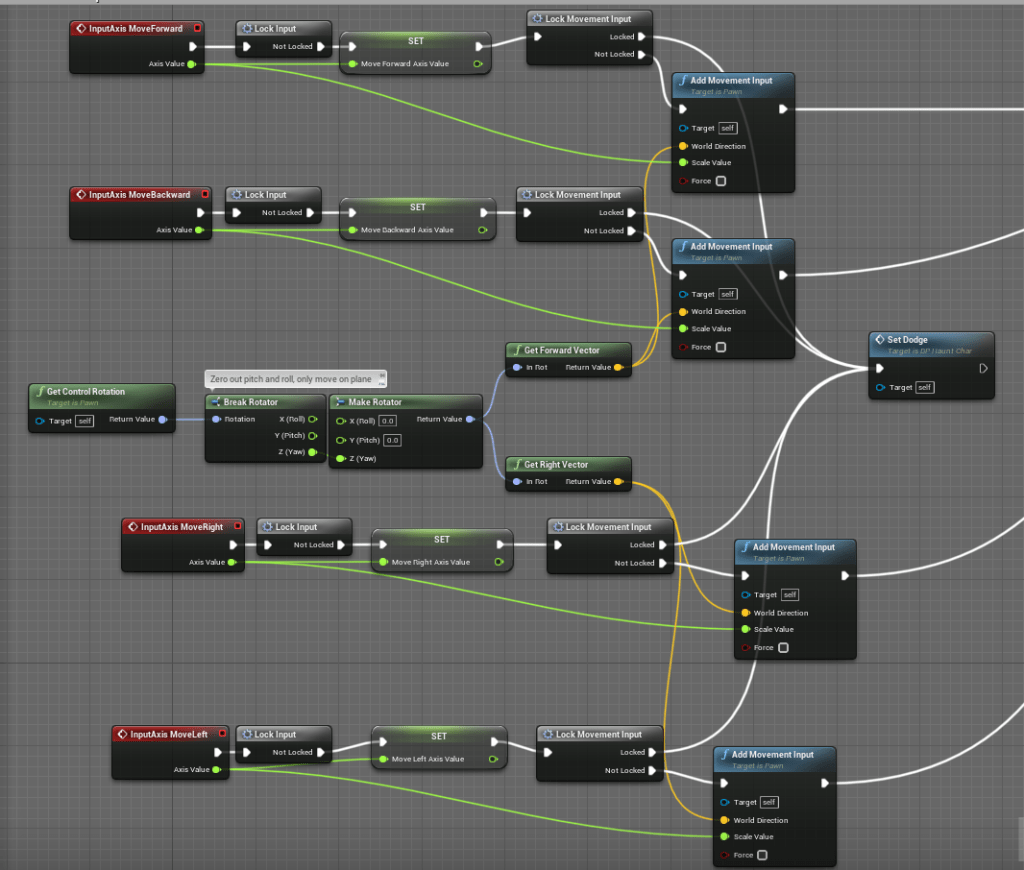 Some of the dodges always felt a bit inconsistent to me so I tried to adjust them to where I felt they felt better, changing how fast they were, the distance they moved the character, etc. I encountered an issue where the character would not dodge in the direction they wanted to if they tried to dodge while attacking. This was for two reasons, one was because I had locked the movement input so it wasn’t setting the direction of the dodge, and I had set the dodges to only work if the character was moving. So I updated those logics and it began to work again.