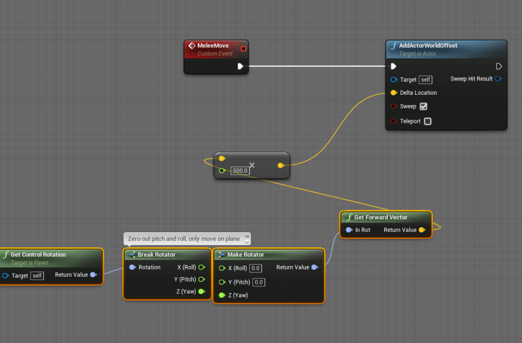 After awhile I realized I could get the character to move using the function add movement input, the same method that used the movement inputs to get the character to move. So what I needed to do was added a notification to let the character move for a certain period in the direction the character was facing. And while this was happening I needed to turn off the movement input so that the player can’t move the character while they are attacking. I don’t want it to be too easy to shift the direction in which the character is attacking. It needs to be deliberate and precise.
