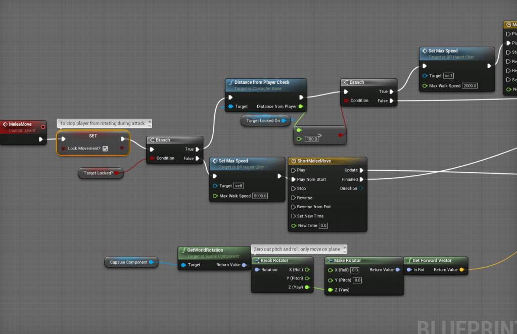 My problem with the melee attacks is that when you aren’t locked-on, it was hard to change attack directions if you are already attacking. You would have to stop attacking and then rotate the character to face the direction you wanted to attack. I wanted the player to be able to dictate which way they wanted to go without having to stop. The flow didn’t feel great if you had to orient the character which took too long.