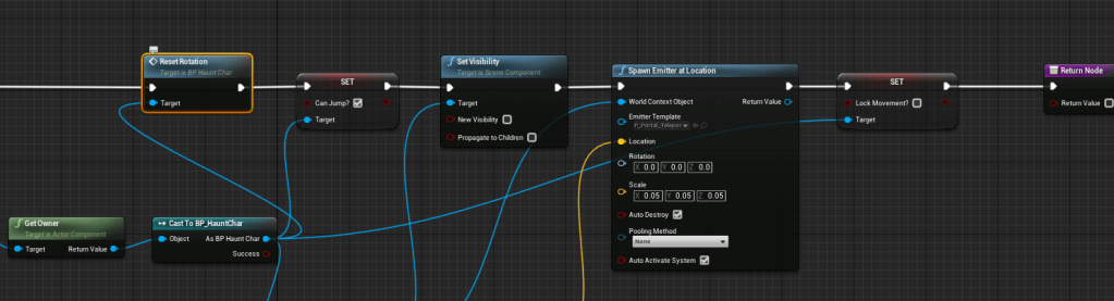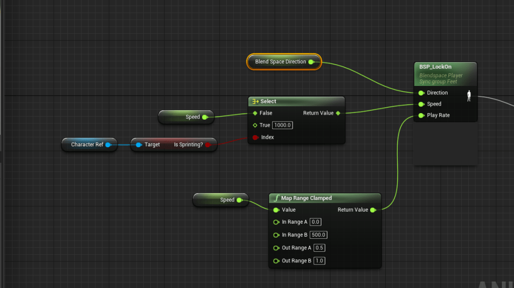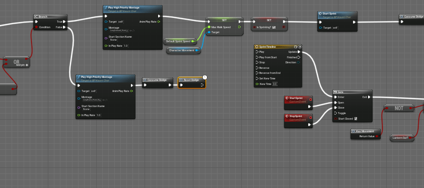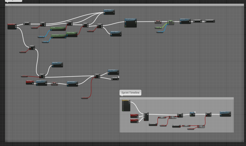 Since I overhauled the dodge function it took awhile to get it working again because I rearranged some of the node and logic and I broke it for a bit. But after some testing and debugging I was able to get make it problem free again. Essentially it wasn’t dashing when it was supposed to, and the sprint was broken. I broke it again by trying to create a special sprint event where you had to hold the sprint down, but it didn’t function well because it delayed the dodge. I wanted to try to make a separate sprint action because I didn’t like the way the dash blended into the sprint. After fixing the broken dash and sprint mechanic I was able to find a solution for the animation blending. The issue was occurring because the speed of the character was set to 0 at the end of a dash, but right after the character would start sprinting at 1000, so the jump was too far. In the animation graph I set the speed to say at 1000 if the character was sprinting.