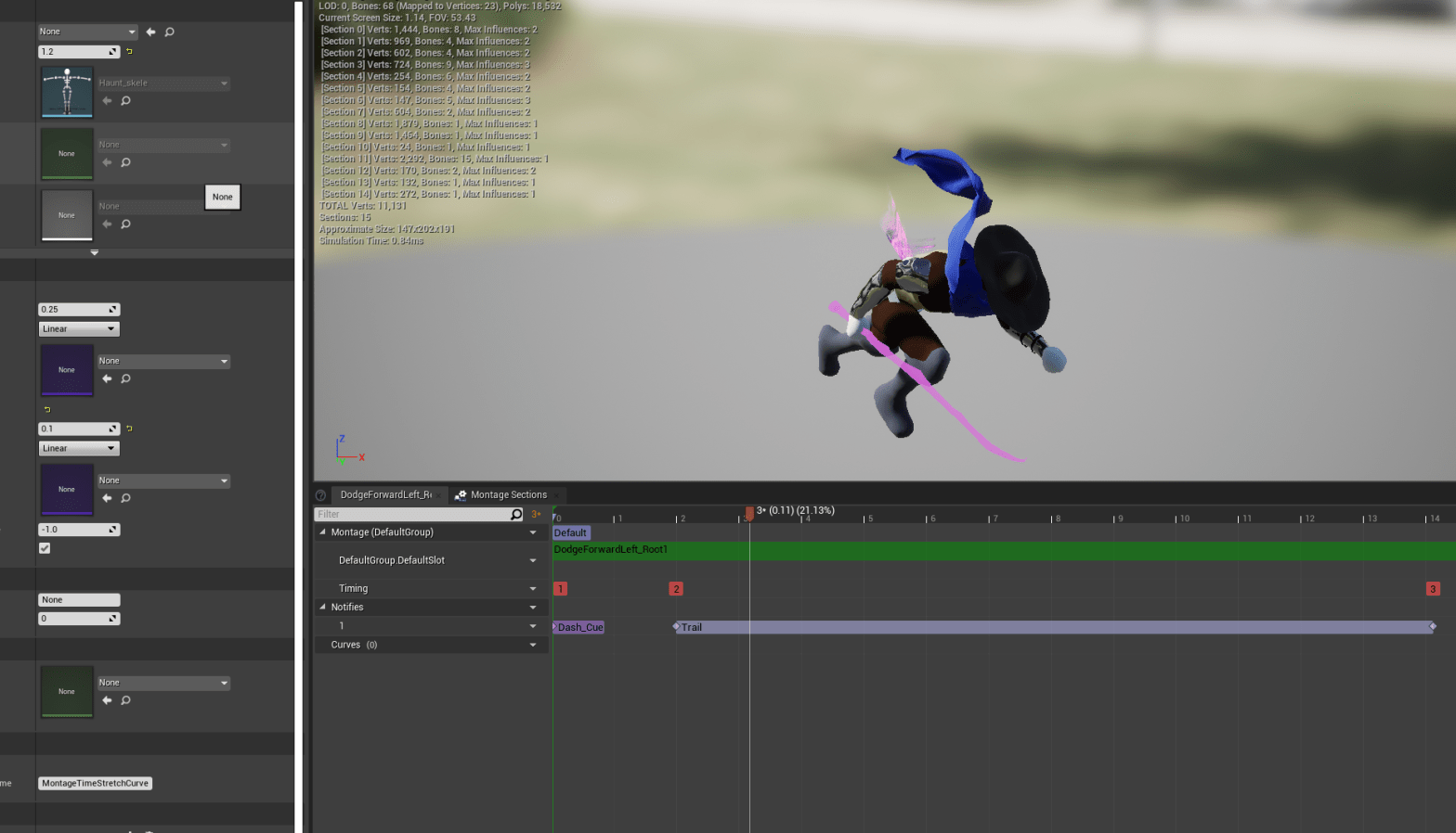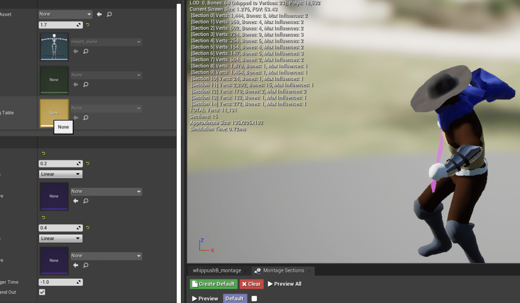 Updated one of the strafe animations to make the posture appear more fight ready. Fixing the dodges took awhile, and I noticed some choppy animation at the end of a dodge. I realized it was because of the turning animation I had set up awhile back. I’m not sure why early on I had a problem with the character model simply turning without a turn animation, I thought it didn’t look nice. But the turn animation rarely showed up in my current version of the game, and I had no problem cutting out something so unnecessary. It was taking up space in the anim graph. Once it was gone the animations moved relatively smoothly again. Less is better in many of my cases as a solo developer.