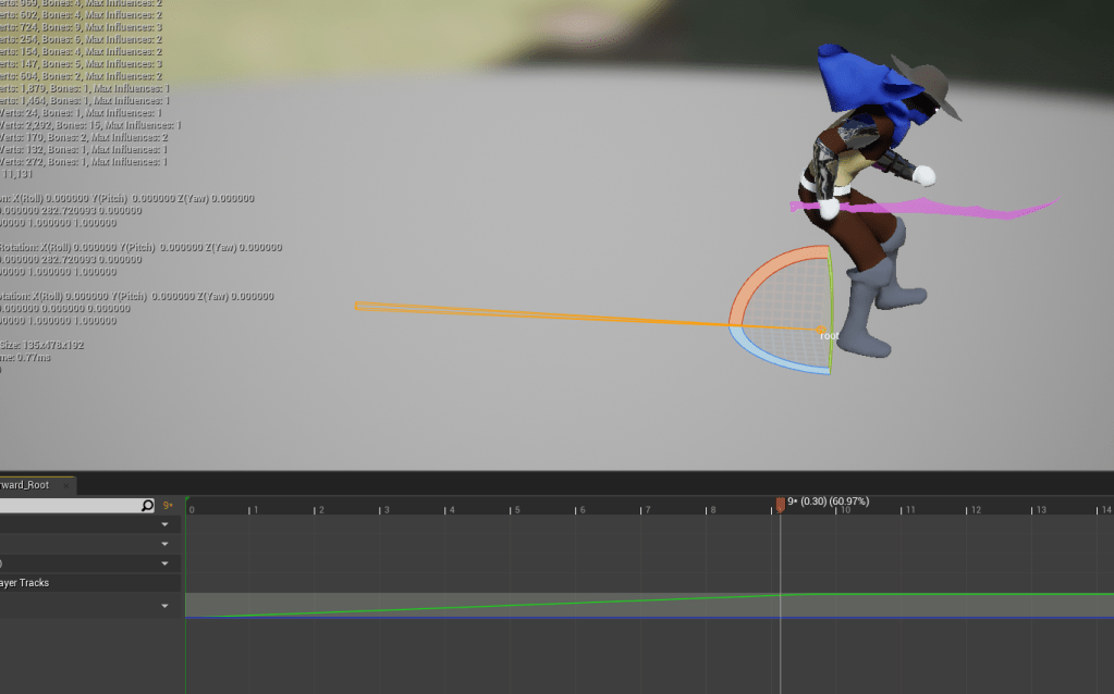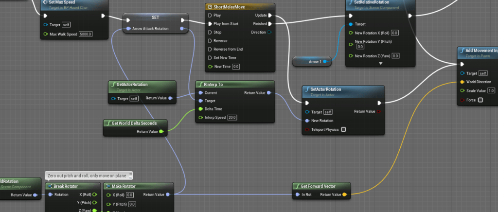 I tried a complicated method of attaching an arrow to the character, which I wanted to point in the direction that the player was trying to go to. The problem was that it was attached to the character itself so it would move relatively to the root of it. I tried instead setting a relative rotation, but it would still not stay in the right direction. I wanted the arrow to move independently from the character, but I couldn’t get that to work properly along with the melee because I also needed to rotate the character to the direction the arrow was pointing.