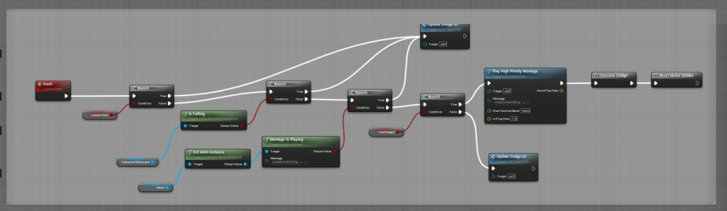 After that I ventured over to my other big change to the movement. I looked to my dodges and didn’t like how they felt too varied and unreliable. Awhile back I watched a tutorial to make the special dodge for the forward dodge. I have no recollection of how it works, but it gives the player the ability to slightly guide the character while dodging. I tested it for the other directions and it can dodge in all directions. I never realized it before because I had never set it up for when the character was locked-on. I am learning to be more efficient and realize when there are things I need to cut. So I got rid of all the other dodges.