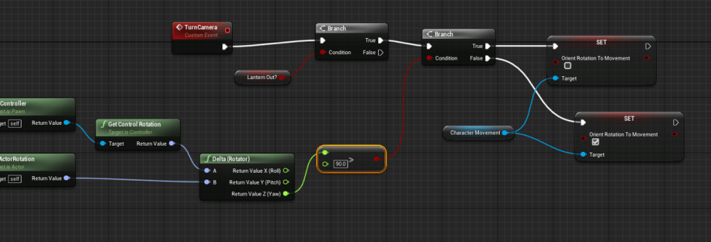 I played around with how close the camera zooms in as well, making it nice and close for really detailed inspections. Added a function to set and reset rotation, and then I took out the function I had made. I took the logic I used for my melee attacks and applied it to the lantern, so it still limits where the player can look, but if they wanted to turn around quickly they can easily do it without having to move too much which was the problem with a slow speed.