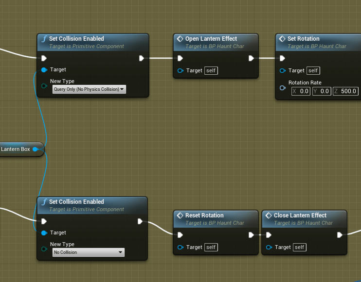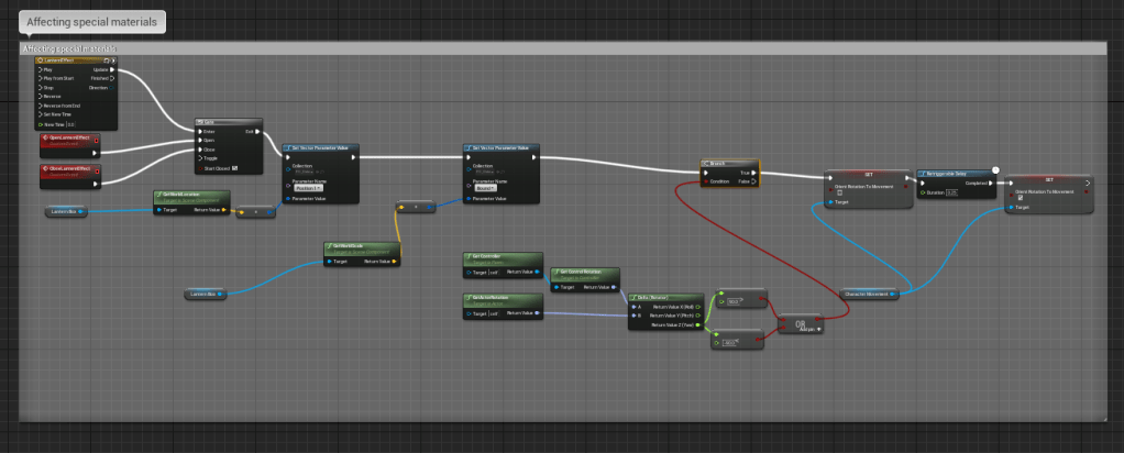 The lantern animations hadn’t been touched in awhile so I thought about what I wanted to change. I tried long and hard to figure out a way to get the character to rotate in the lantern mode when the player tried to rotate past the max axis for the lantern aim. For awhile I got some logic working where it would temporarily rotate the player slowly to adjust to where the player would want to look. It took awhile to get working and I thought there were no issues after then. Then I started walking around in different directions, and the model started freaking out. There were set backs to my logic and it didn’t let the character have a smooth rotation because I tried to slow it down too much.