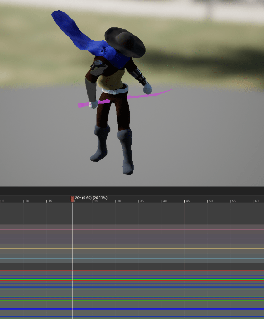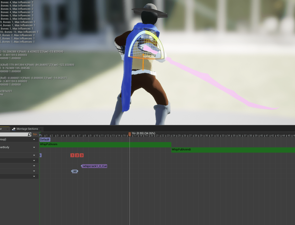 I then looked to my whip animations, playing around with them in-game. It made me realize how lacking the pull animation was, because it has the animation to “grab” an object but none that conveys directing the object. Essentially the animation I had was too short, and lacked follow-through to when the object was being hurled. I first tried adding the same animation but backwards, to give the effect of pushing the object away. But reversing the animation does weird things and I couldn’t get it to work.