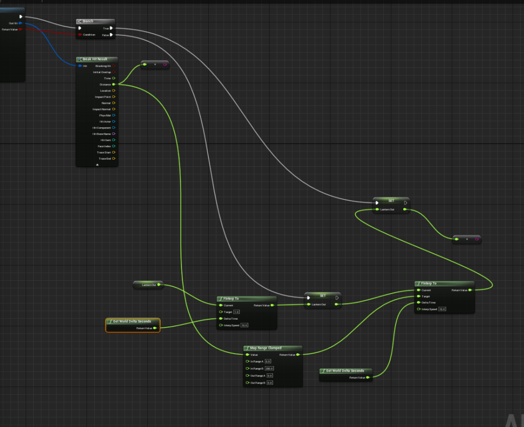 Having decided I was happy with where the lantern animations were I set up some construction script logic for the character so that when I changed the default values of the variables I didn’t have to go and set it for the variables they were assigned to. This way I don’t have to worry about forgetting to change the values.
