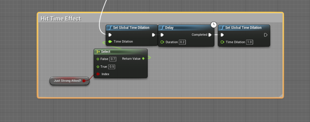 The next thing I wanted to figure out was how to add an animation freeze on a successful hit. Animators do it often for fighting games to make an attack have even more impact. I couldn’t find a reliable source that talked about it, but I will try to keep looking. Instead I used the time dilation function and skewed time just for a small fraction of time that is barely noticeable. But it does help add more impact to successful hits.
