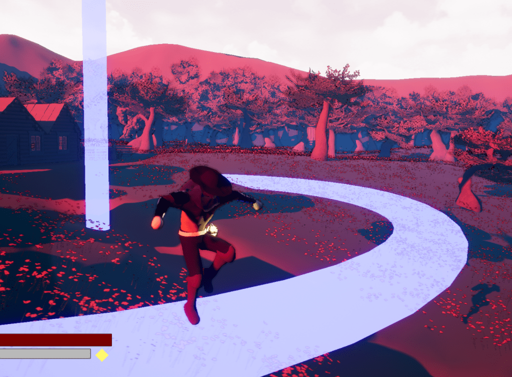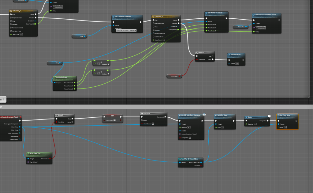 Besides that I added a new object that is a pillar of light that appears periodically where the player is. At first I had it doing basic damage. I used the ring model I made for the first boss and repurposed it here. Using a specific material and two different timelines I made the spawning of it less sudden, it appears transparent when it appears and then fades away as the ring expands. It is a nice and simple effect, these are core tenets I need to stick to. I don’t want to make something complicated, as long as it is effective. The special thing about this ring is that is slows the player down. I was able to change the play rate of the animations, creating a function in the character so I could grab it easily as well. This fits the time theme well.