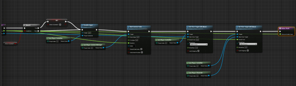 After that I did the first thing off my checklist which was add a camera pan to the level. It starts from a camera high above the map then transitions down to the player. I used the logic I had from the first level so I could create a function within the player character, this way I can use it for future levels without having to remake the function. Eventually I’ll need to learn how to create cinematics and use the sequencer.