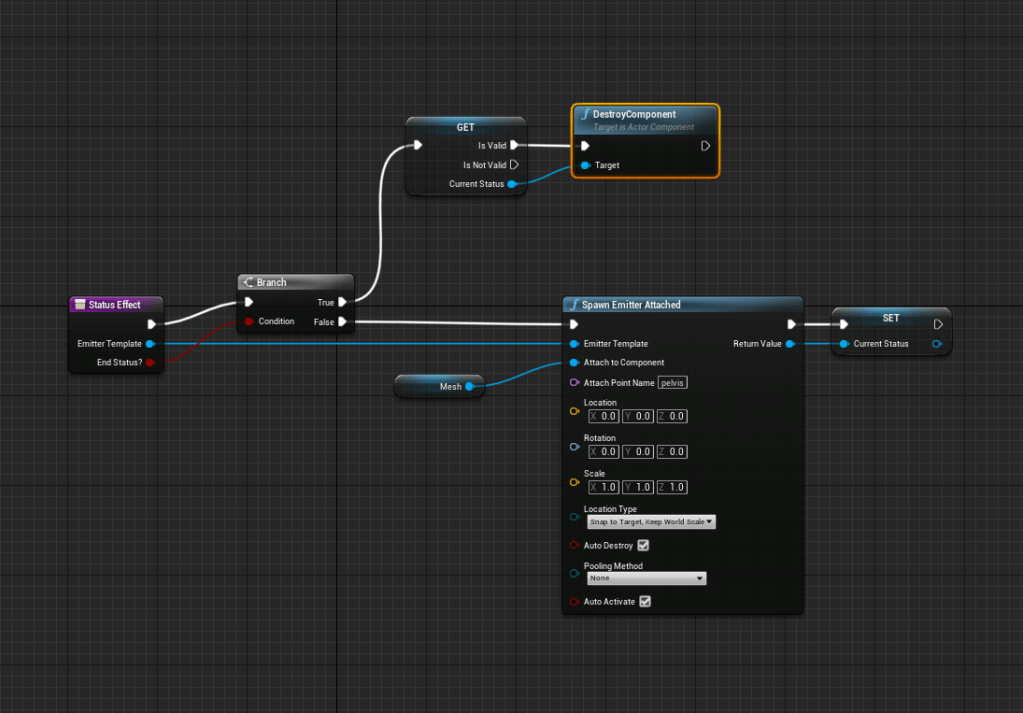 My last additions were adding an impact sound of the boss, found more cool sounds from the hundreds of new ones I had. Then I added a function to the character where I could attach effects, a “status effect” that could easily be destroyed since it was on a loop. I wanted a way to communicate to the player when they were slowed, or their gravity was affected, and eventually other interesting mechanics as well. It is funny because I remember trying to set the player on fire a few months ago and I had no idea how to do it, so I gave up on it. Today I was able to do it quite easily, my grasp of Unreal has come a long way but it still lacking in many areas. One step at a time.