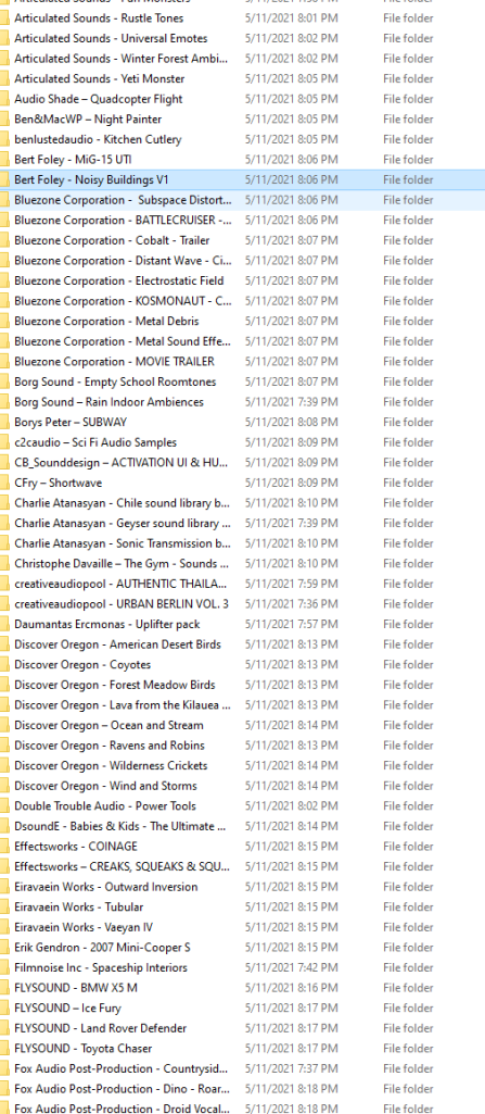 I started digging through the sounds I had downloaded and I finally checked how many there were. It’s around 3500 sounds. So I started the task of listening to each one. It is difficult to find specific ones when I don’t have anything I am looking for. What I was doing was going through and sorting the ones I felt would be useful later, and if I found something I wanted to use immediately I added it to the game. Some sounds I found replaced the current ones I had in game. It’s a lot of sounds. Replaced the rain sound in the first level, and replaced the shout of the golem. I was able to sort through at least 900. I will continue listening through them tomorrow.