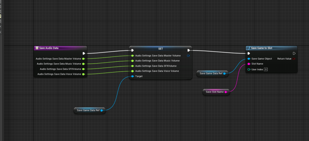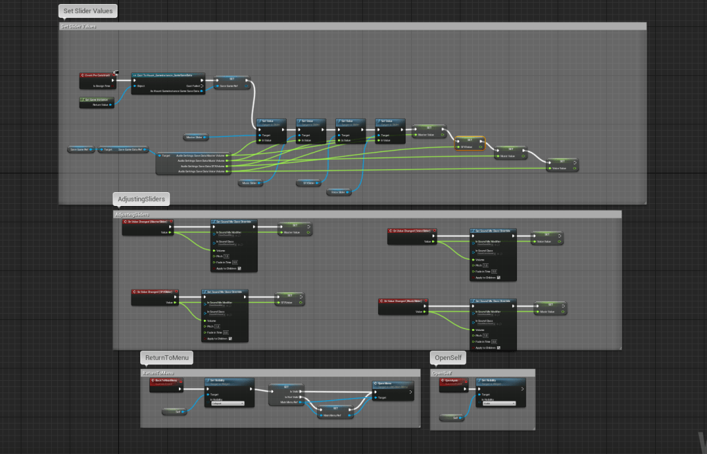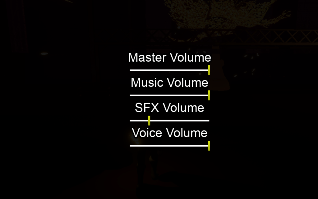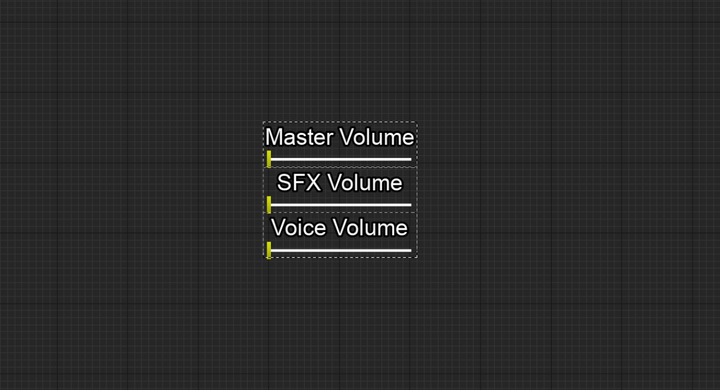 After going through the chore of making sure each sound was in the right category I created the sliders and menu where the volumes can easily be adjusted. I realized I couldn’t do it the same way as I did the brightness since it doesn’t have an object to grab from. But it is better that the function I create to load the settings is directly grabbed from the function itself. So using that logic I updated the brightness settings as well because it was not a good setup.