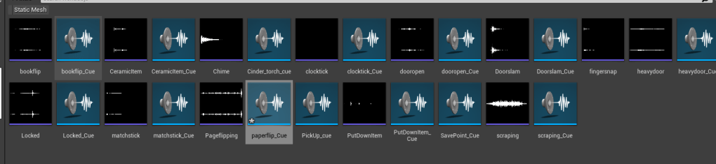 While sorting the sounds I went and fixed, replaced, improved, etc. the sounds in the game. From the dashes, to the hits, the steps, you name it. I wanted the inspectable items to have different sounds depending on the type of object they are. I won’t have too many sounds to select from but it was important for me to have a sound that was the sound of pages being flipped through. I found one of a nice ceramic object being picked up as well. Lots of random sounds inside which was why I had to listen to them all because I didn’t know what I would need until I heard it.