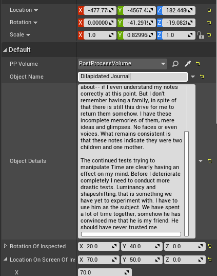 With that out of the way I went to improve and finalize the story for the Clock Cottage. My method for the creation of this level was to create puzzles and mechanics then derive some story for there. While good notes and narrative came from this approach, I think for the next one I will flesh out the story fully before I actually start creating the stage. That way the story will heavily inform my decisions rather than the other way around. With that said I am happy with what I ended up adding to the Clock Cottage. A few more new entries and items to read and find. It ties in everything in well enough.