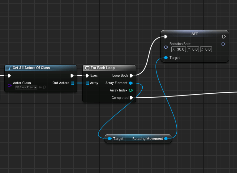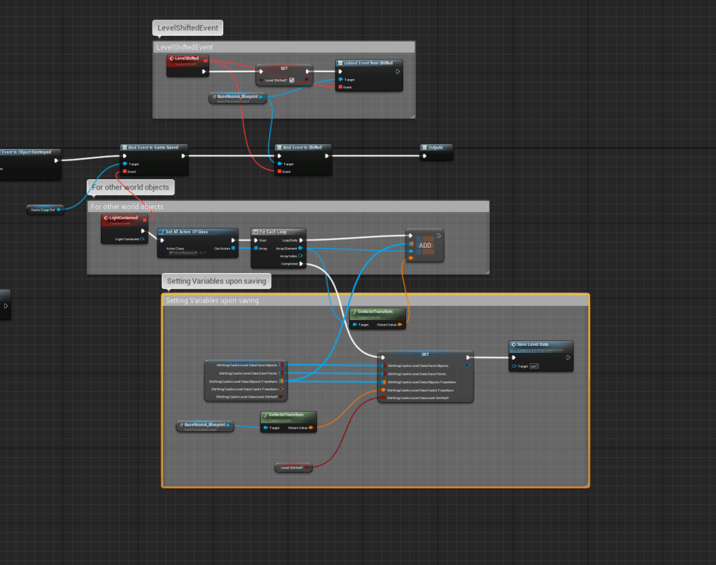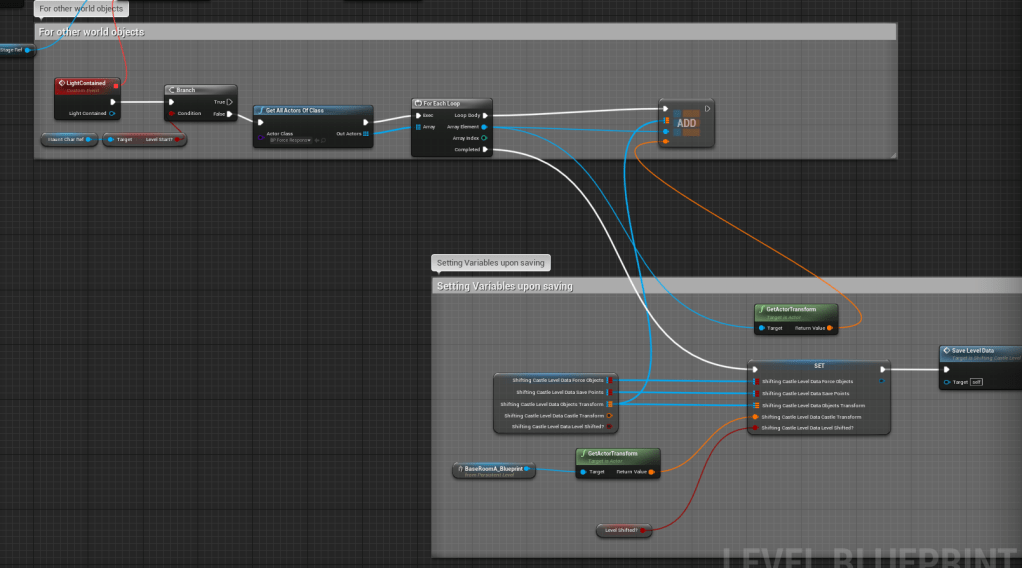 The first thing I tried to fix was getting objects on the building to turn with it. My first try was to attach a rotating movement on the object such as the save points. It is easy for physic objects because they just follow gravity. After realizing that rotating the torch won’t make it follow the building I gave up on that path. As I was clicking objects I found that I could attach actors together in the level itself. I had never done that before so I didn’t know what it meant. So, when I turned the stage over and the torch followed it perfectly I was ecstatic because it was exactly what I wanted.